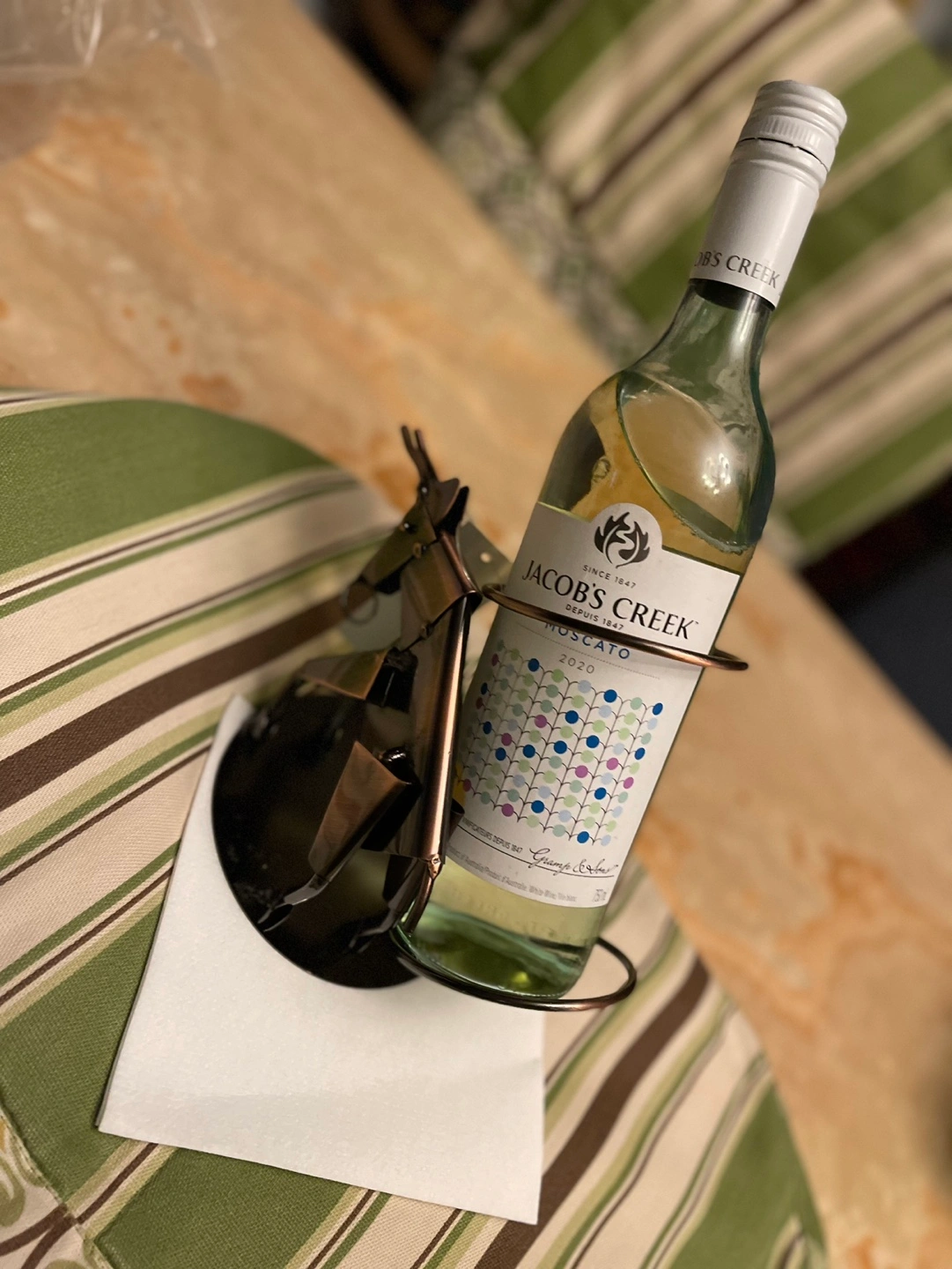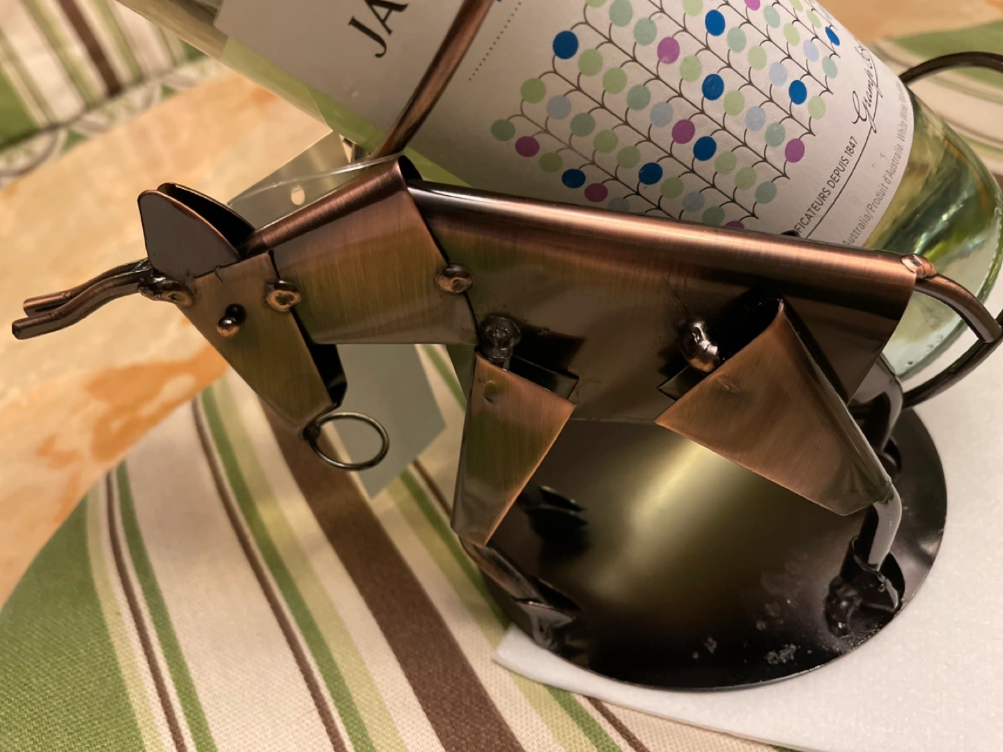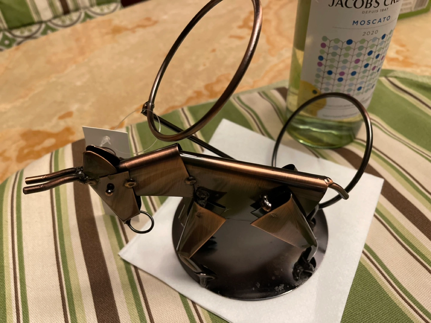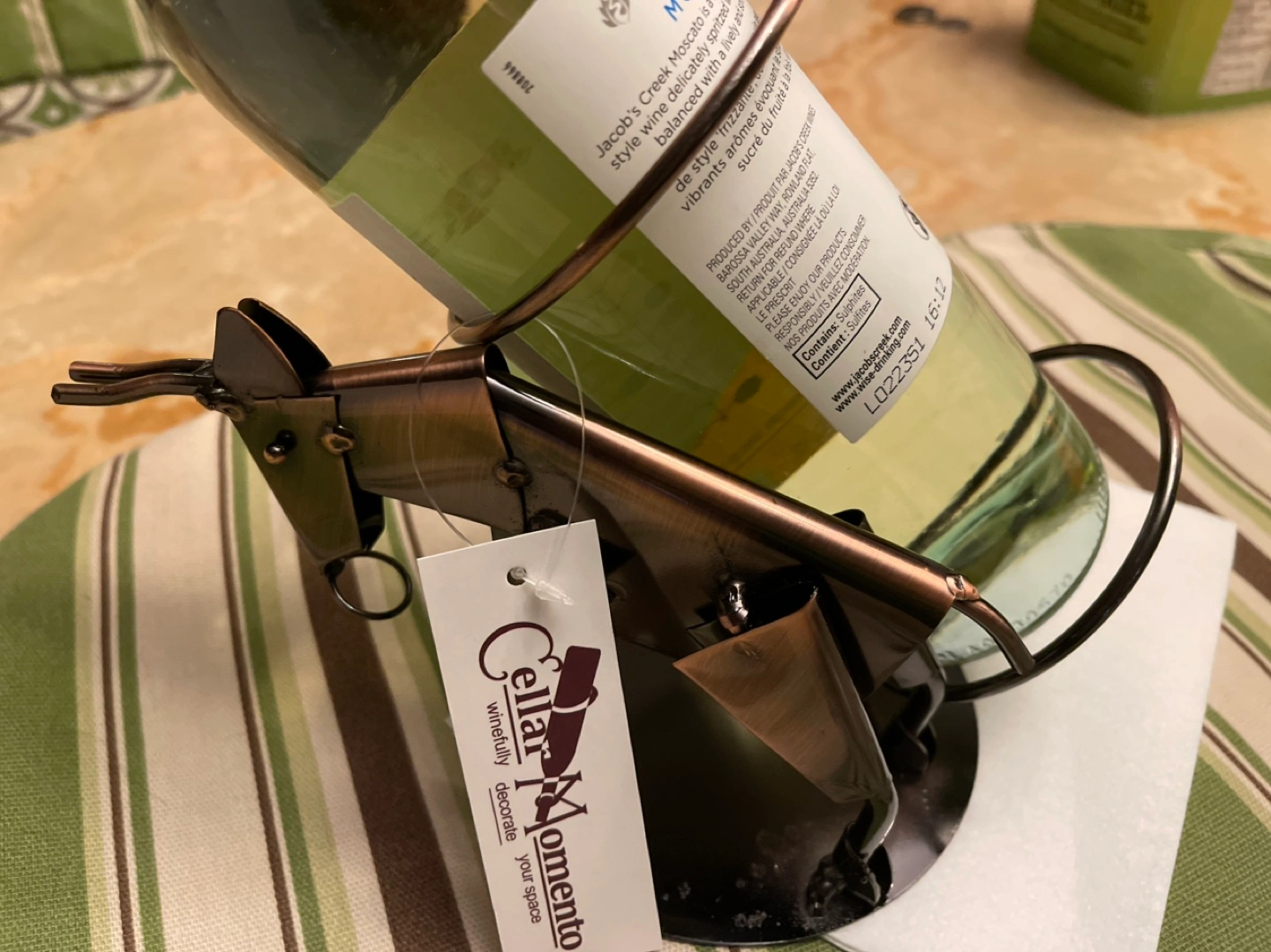 Cute metal wine bottle holder. Brown metallic finish. Shaped like a cow. Holds one bottle. Great for gifting or personal use. New in the box.