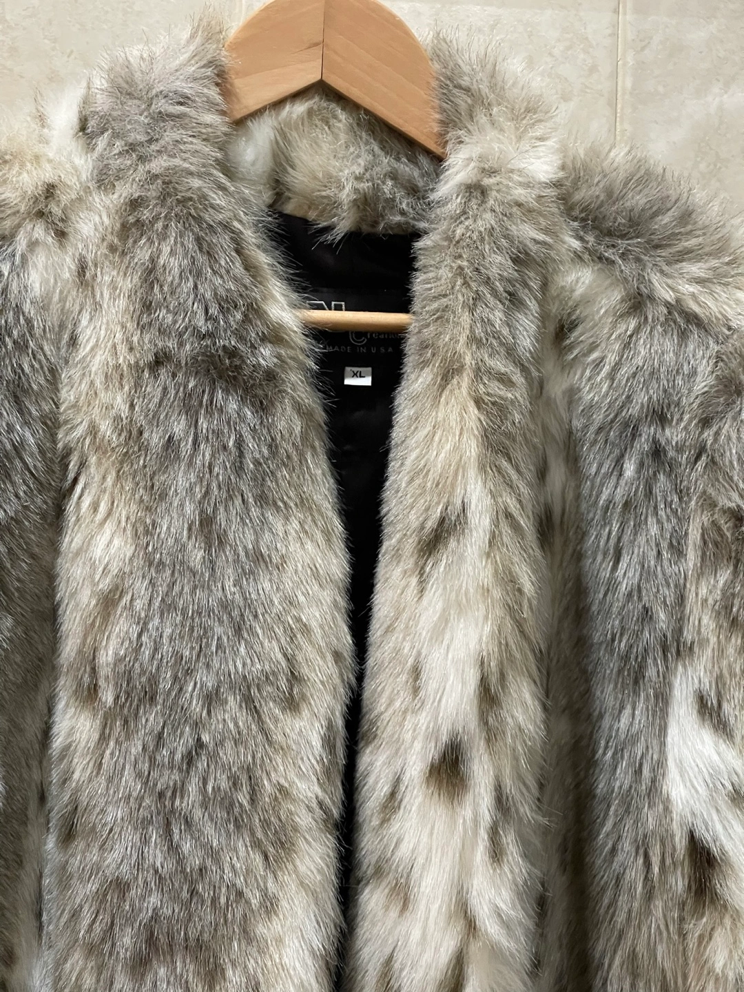 Warm and stylish faux fur jacket. Features a grey and white spotted pattern. Open front design. Two pockets. Size X , XL.