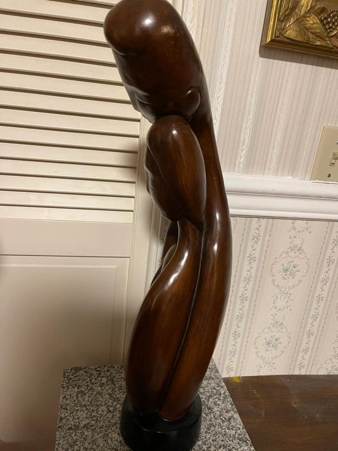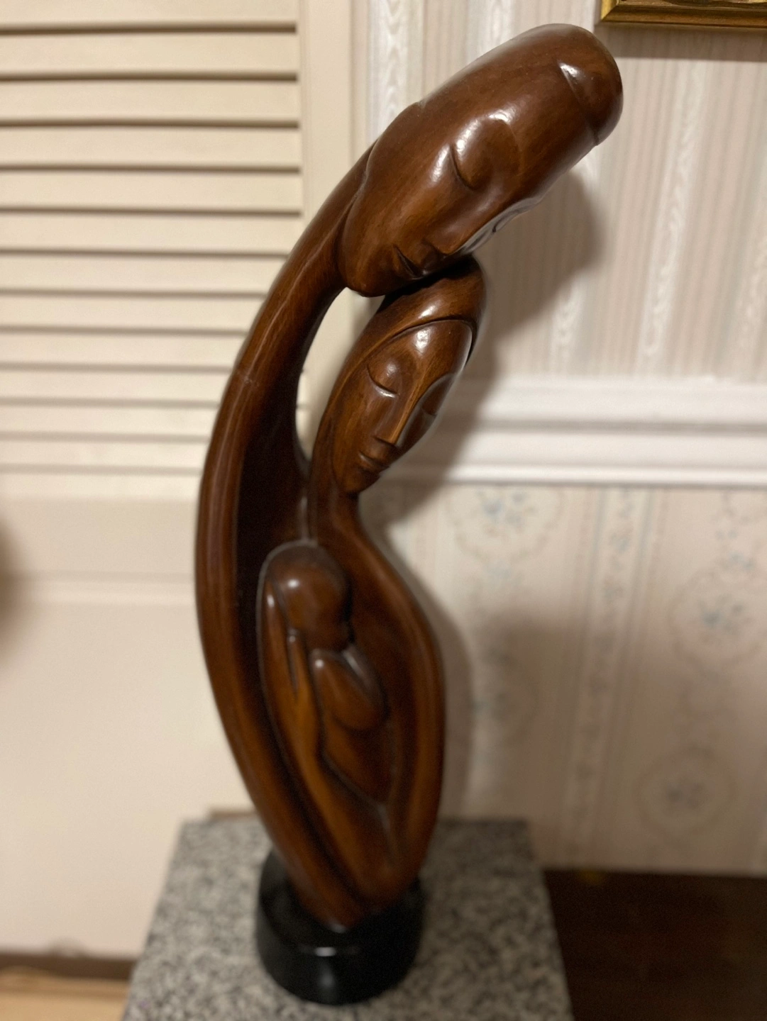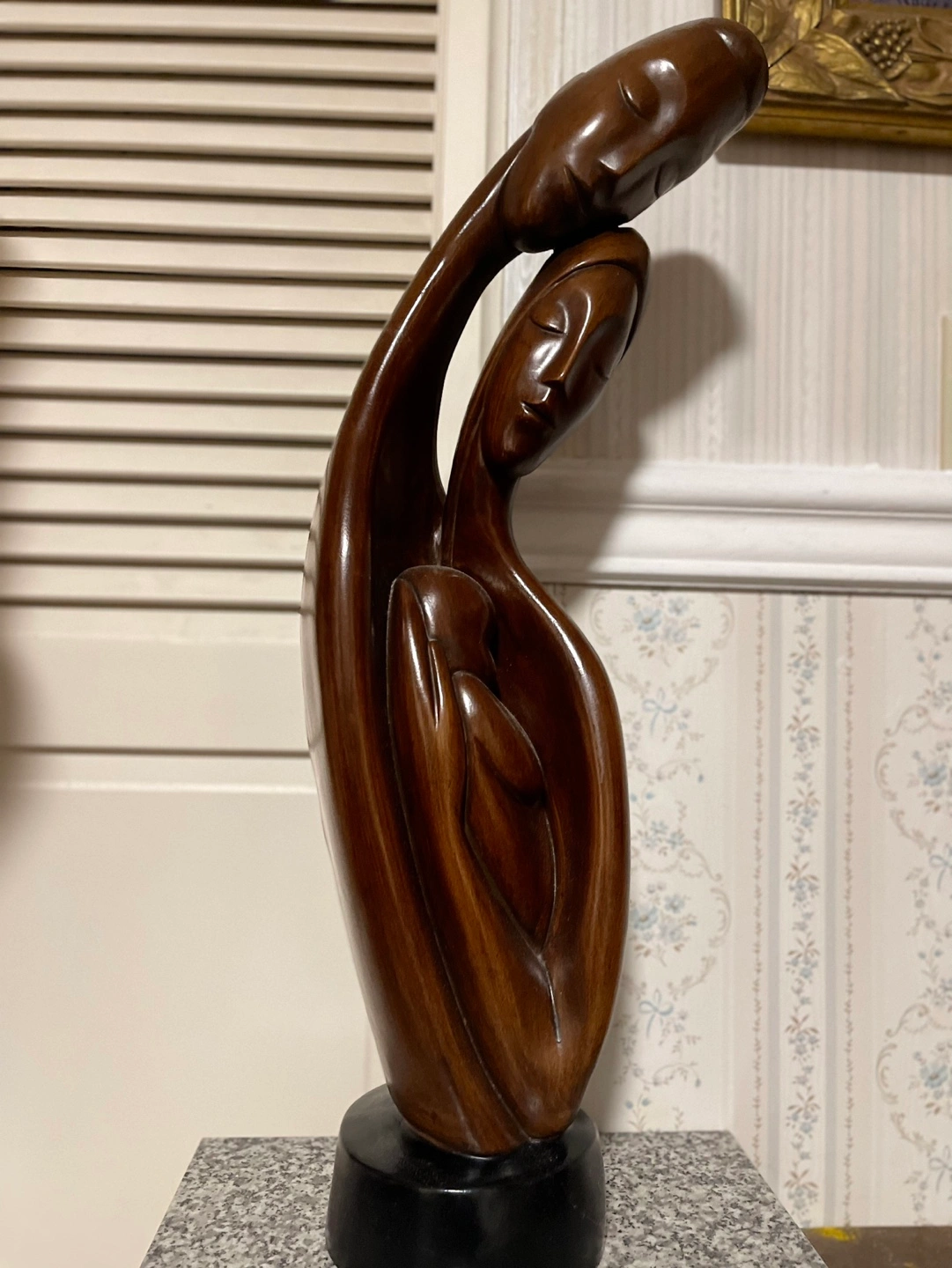 Abstract sculpture. Depicts a family. Dark brown colour. Sits on a small black base. Unique and stylish home decor.