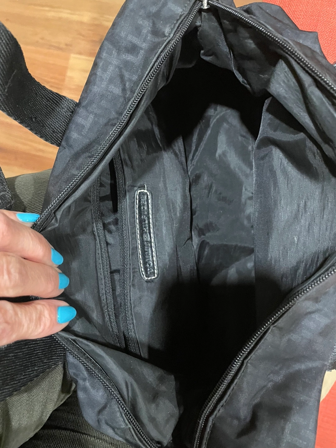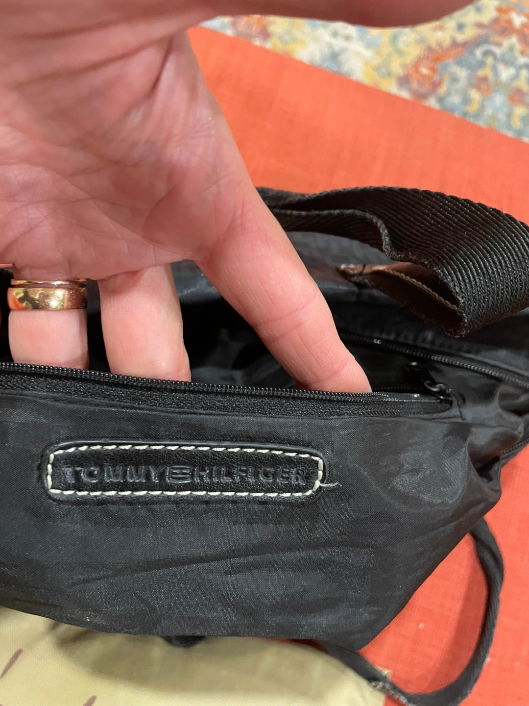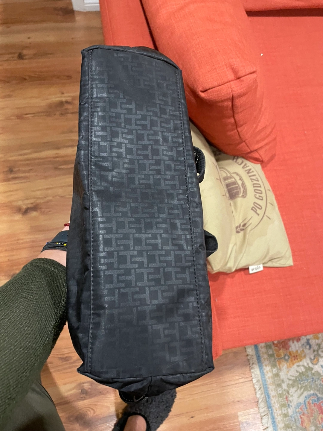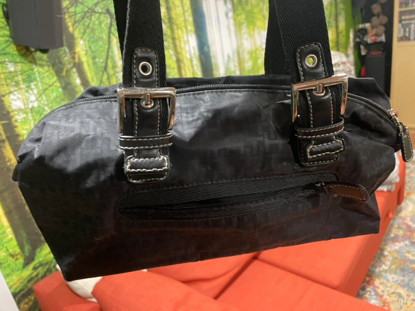 Small black handbag. Features top handles and a zipper closure. Inside pocket. All-over logo print.