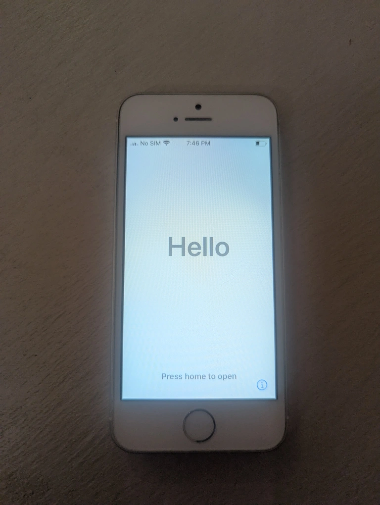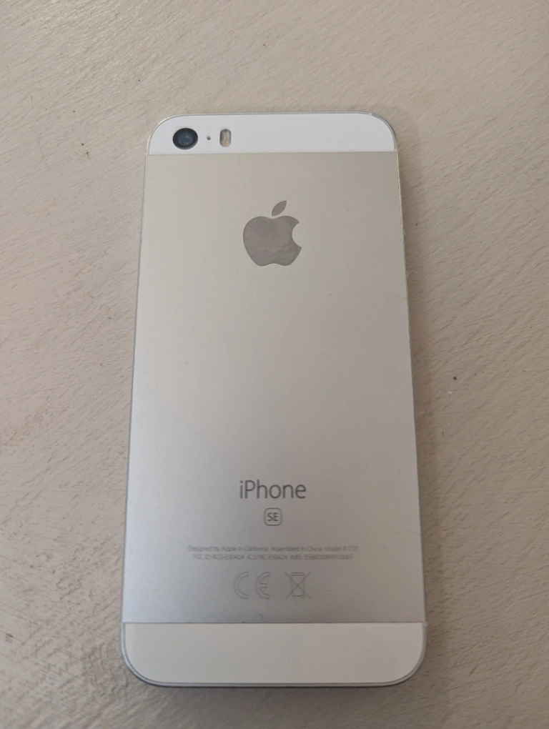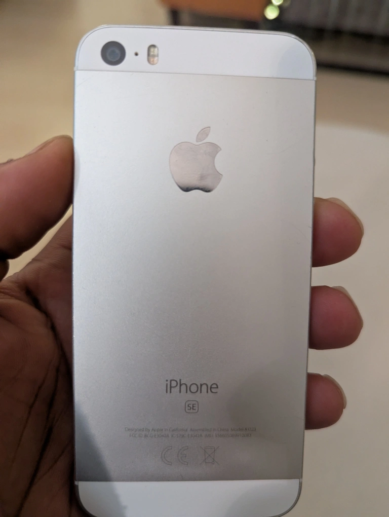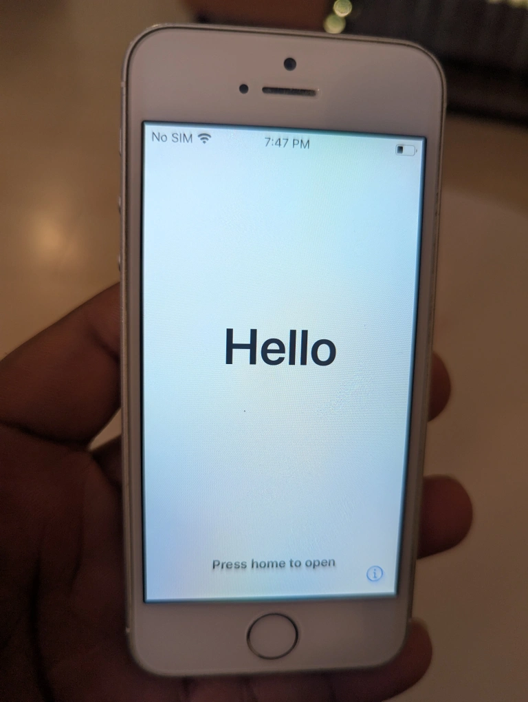 Silver iPhone SE. Shows Hello screen. Pre-owned.