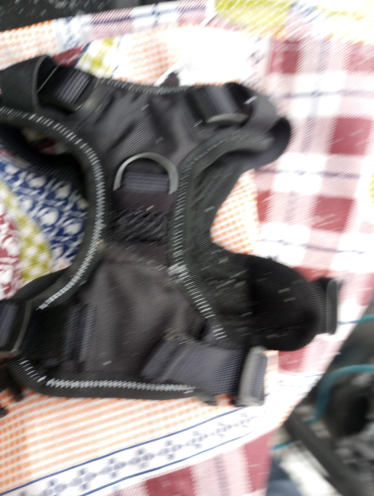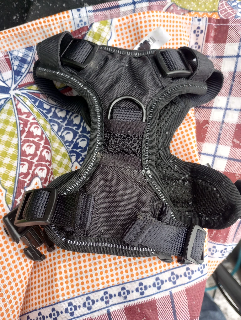 Adjustable dog harness. Black colour. Small size. Features a D-ring and a clip closure. Breathable mesh panels.