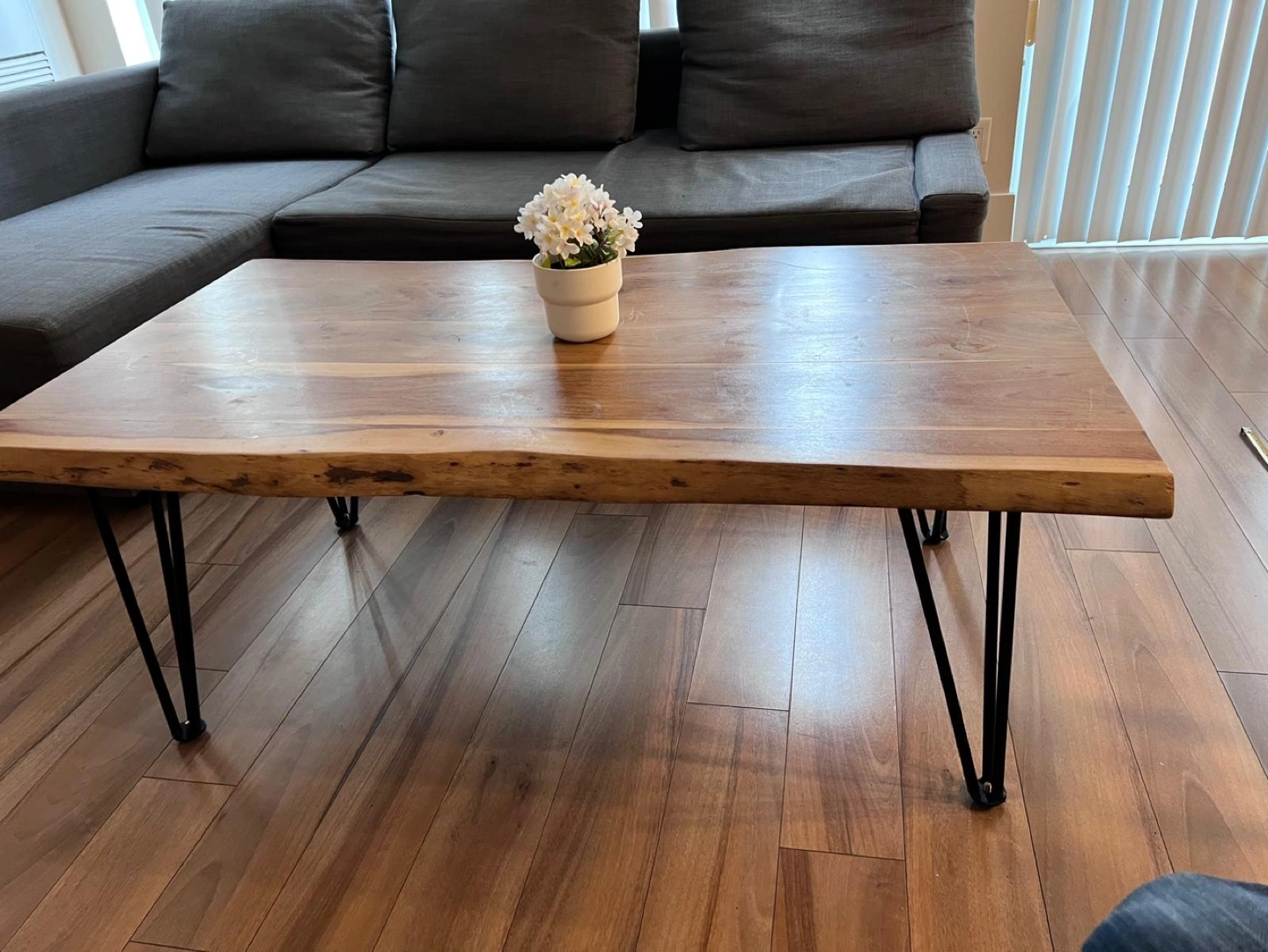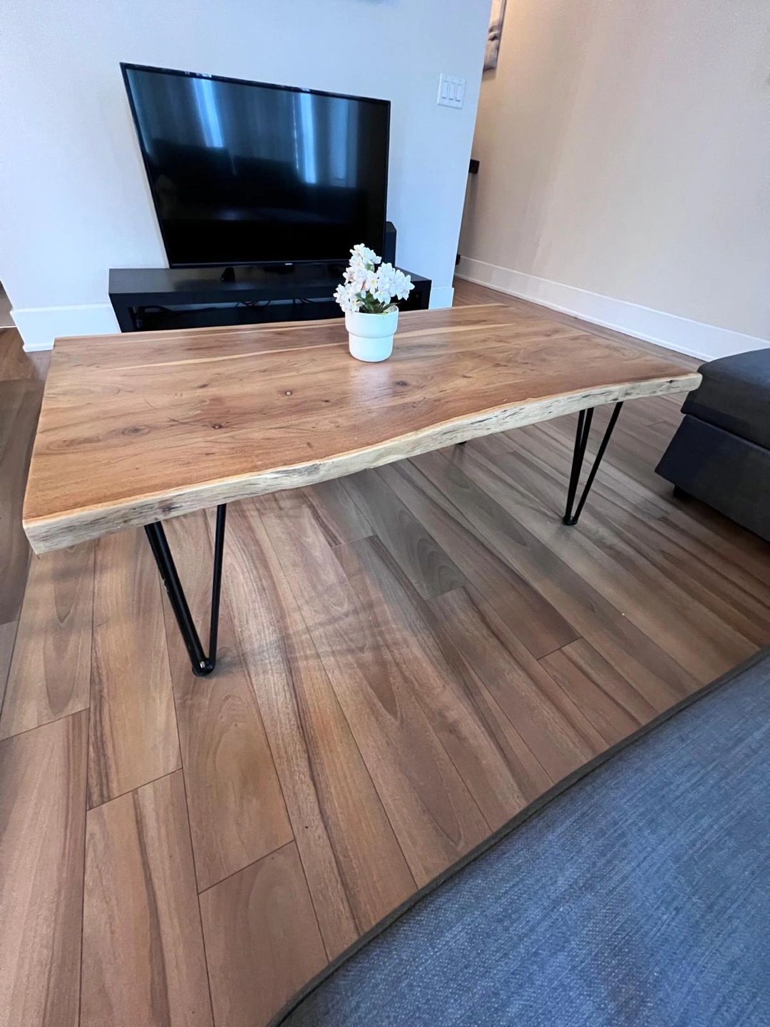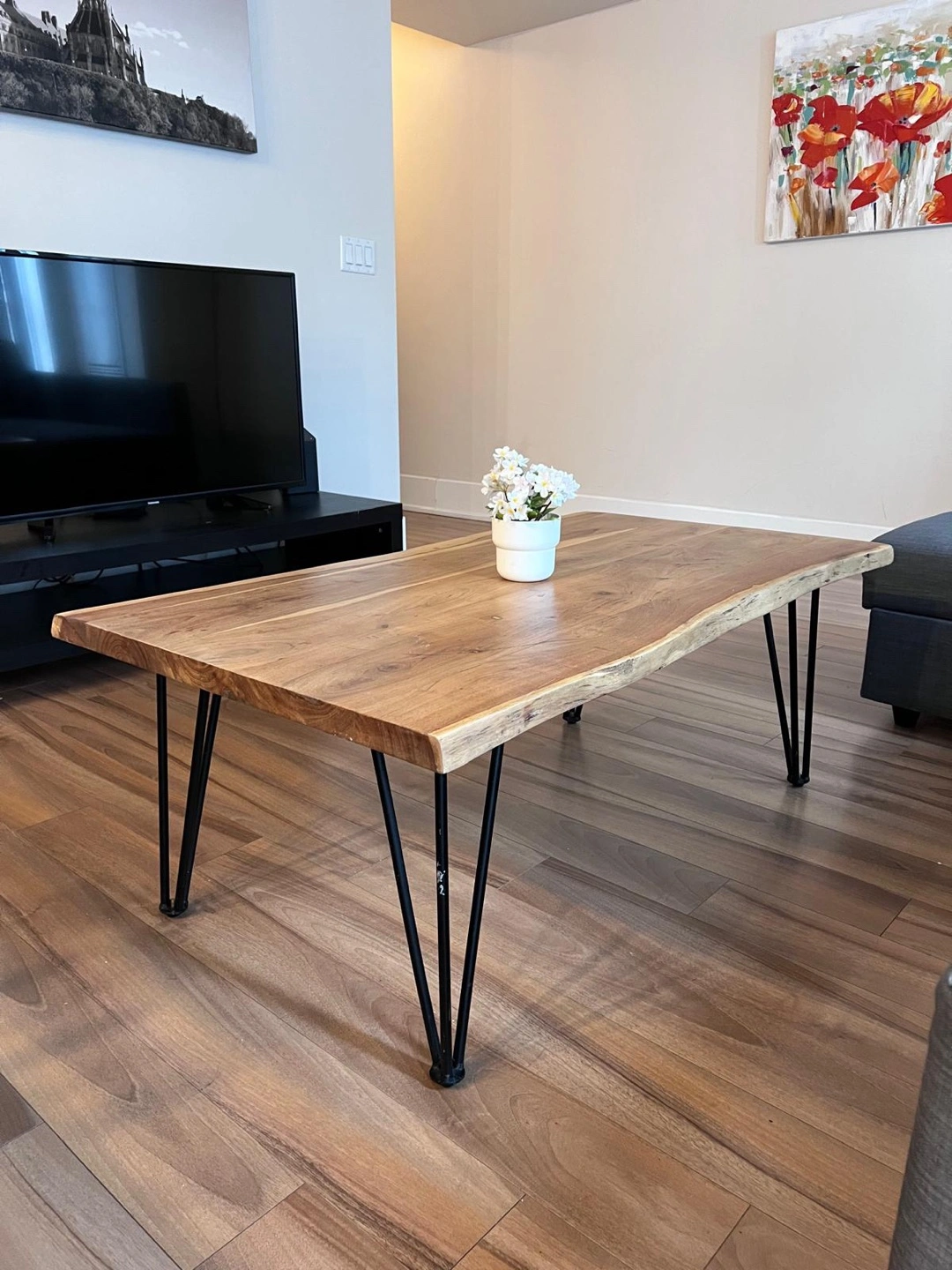 Beautiful live edge coffee table. 100% natural acacia wood top. Black hairpin legs. Great addition to any living room. 120cm length x 69cm width x 46.5cm height. Excellent condition, like new.
