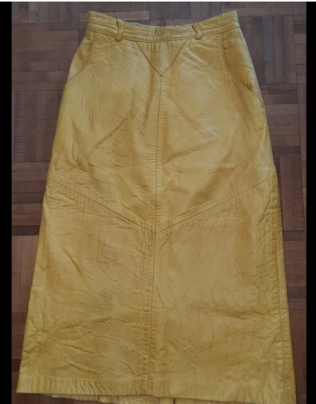 Gorgeous vintage Soft leather midi skirt. Mustard yellow colour. Features a centre front button closure and pockets. Classic A-line silhouette. Excellent pre-owned condition.