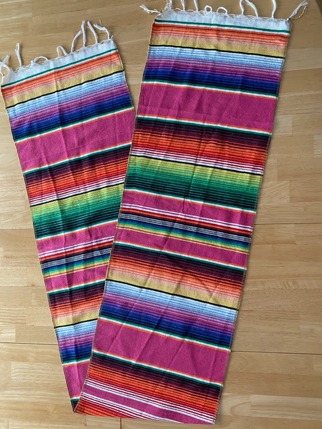 •”NEW” never used, excellent condition •Material: Cotton •Beautiful, colourful Mexican-style table runner •Bright stripes and fringed edges •Perfect for adding a pop of colour to your dining table •Length: 77” x Width: 13” •Perfect for: Cinco de Mayo, Taco nights, Mardi Gras, picnics…… •smoke-free, pet-free environment ** LOCATION: Jane & Lawrence **