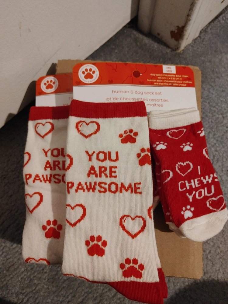 🥕IN THIS BUNDLE YOU WILL RECEIVE: 🥕TWO PAIRS OF SOCKS (FOR HUMANS) ONE SIZE FITS ALL. "YOU ARE PAWSOME" 🥕TWO PAIRS OF DOG SOCKS. 14.3 CM LENGTH X 6.35 CM HIGH "I CHEWS YOU" 🥕GREAT FUN SOCKS FOR YOURSELF OR AS A GIFT FOR THE DOG LOVER IN YOUR LIFE. 🥕I AM LOCATED IN THE YONGE AND STEELES AREA FOR PICKUP.