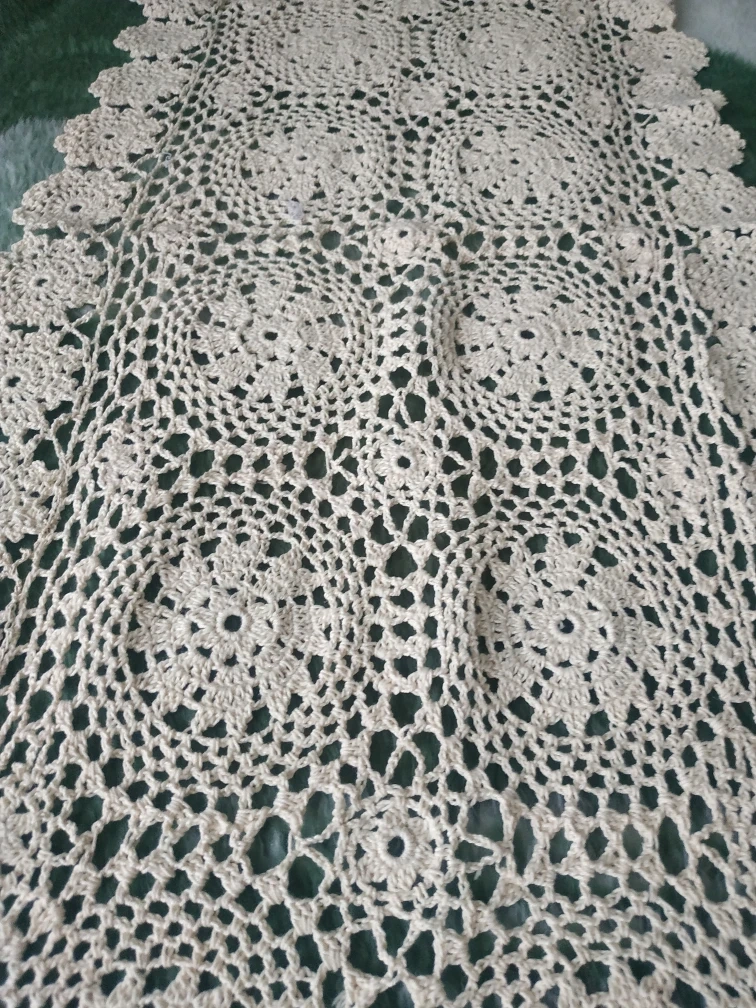 Beautiful, beige crocheted table runner. Intricate floral pattern. Measures approximately 35 inches long. Adds a touch of elegance to any table setting.