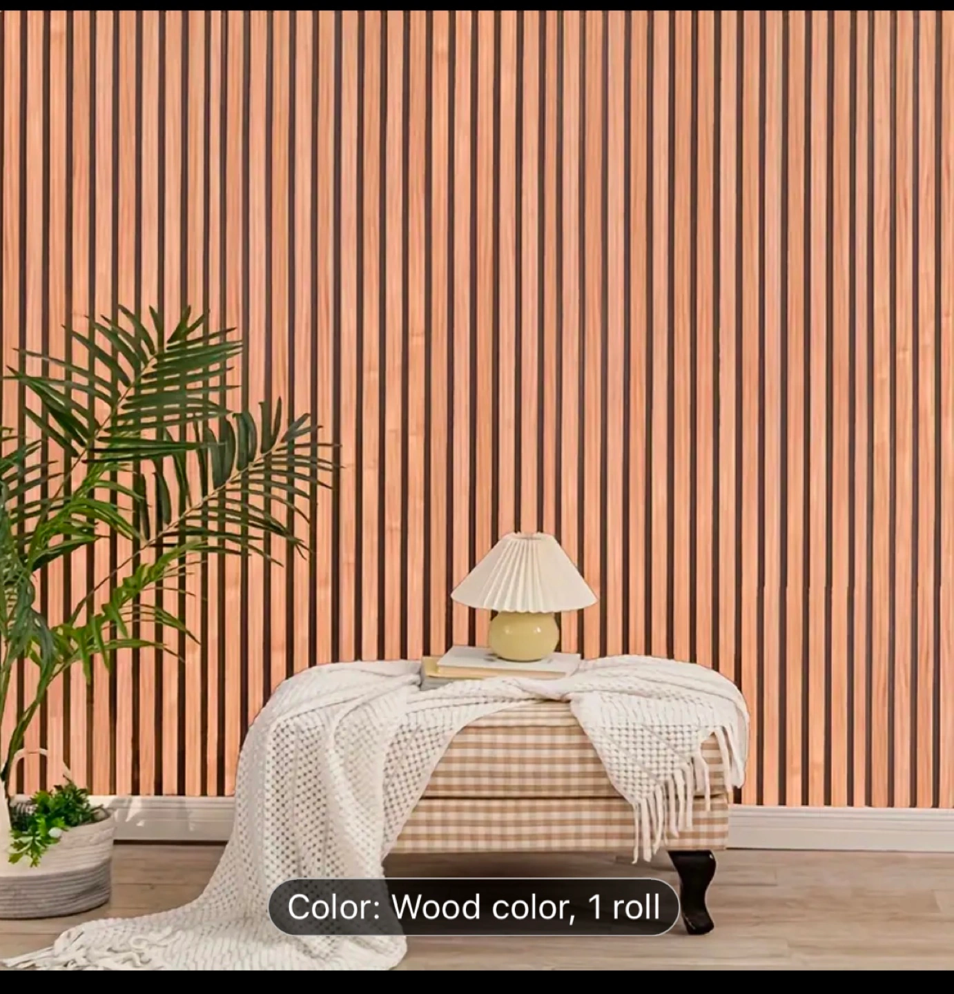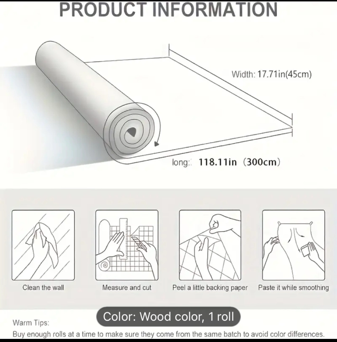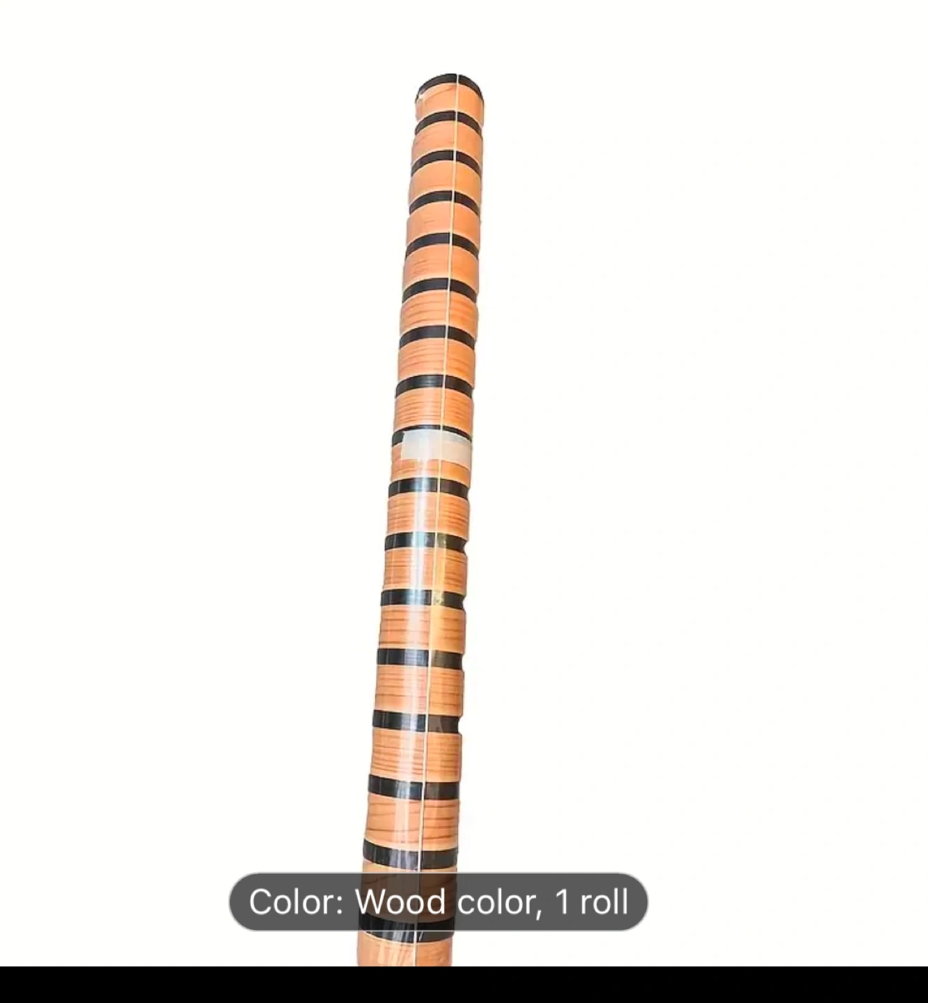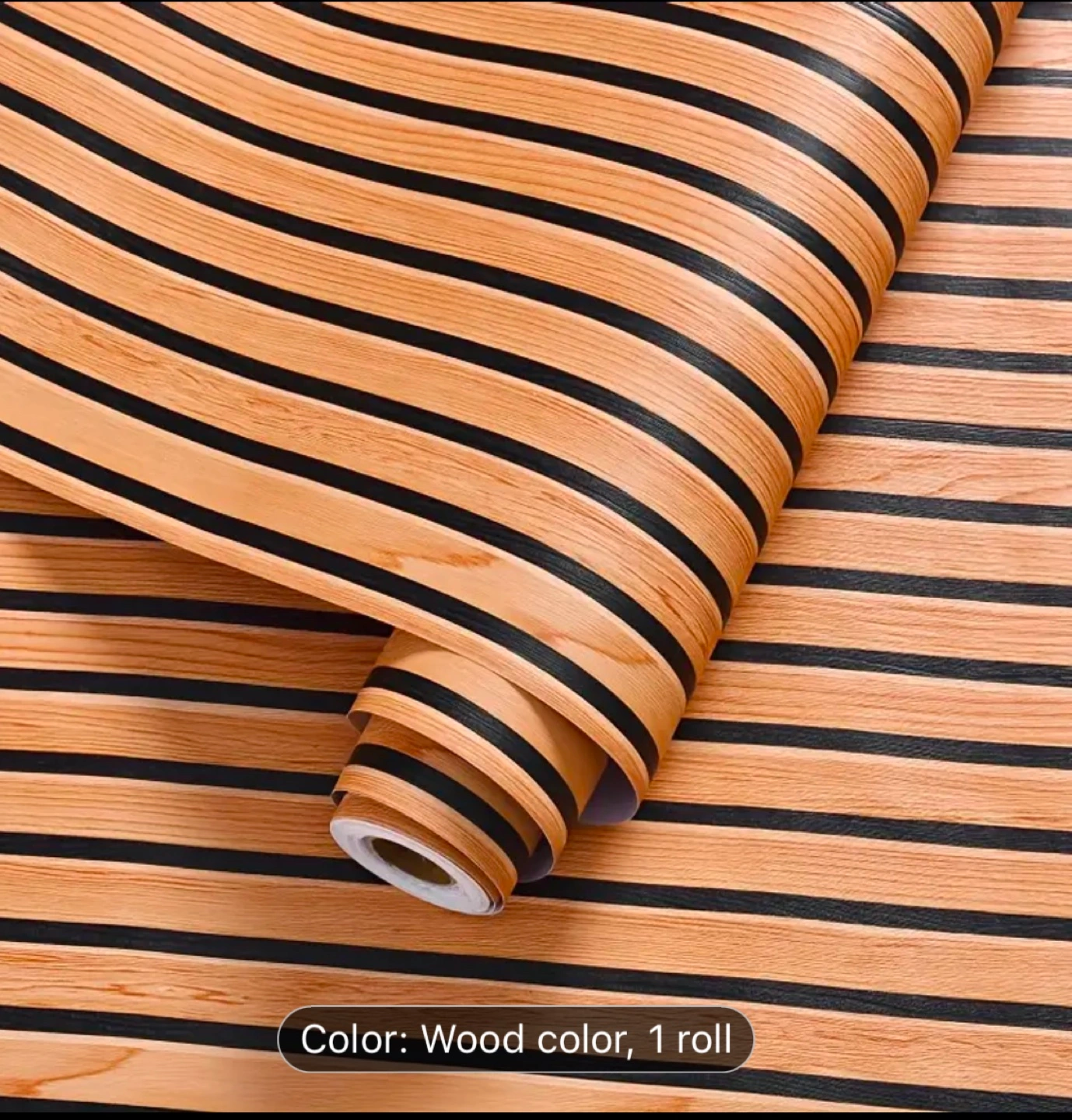 Self-adhesive wallpaper roll. Wood grain design with black stripes. Perfect for accent walls or DIY projects. Measures 17.71 inches wide by 118.11 inches long.