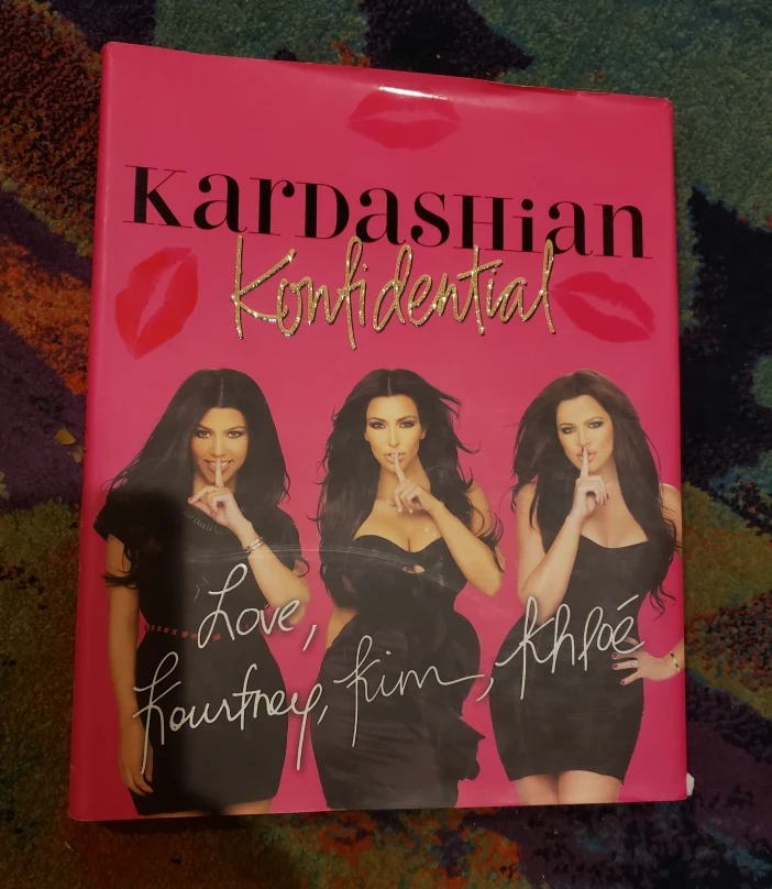 Hard cover book. Features Kourtney, Kim, and Khloe Kardashian. Pink cover with gold lettering.