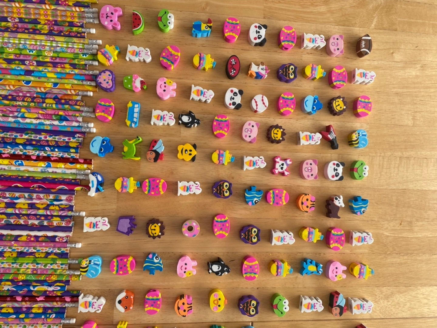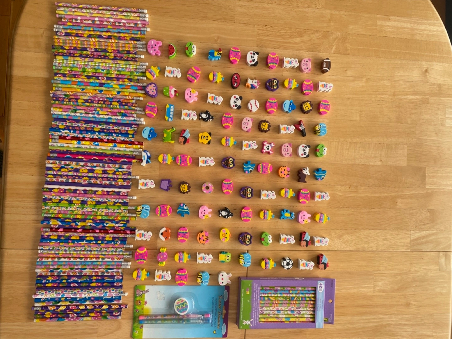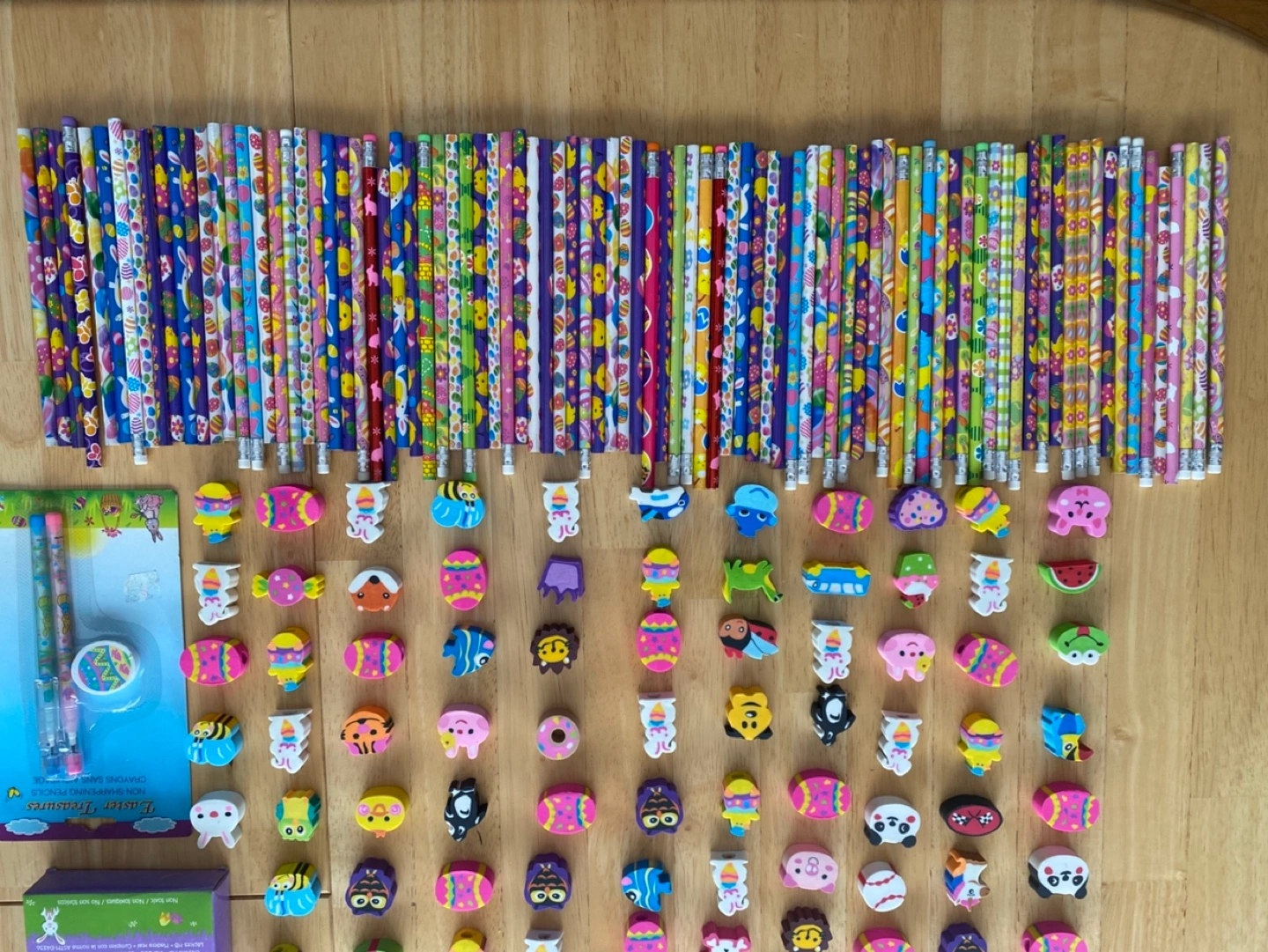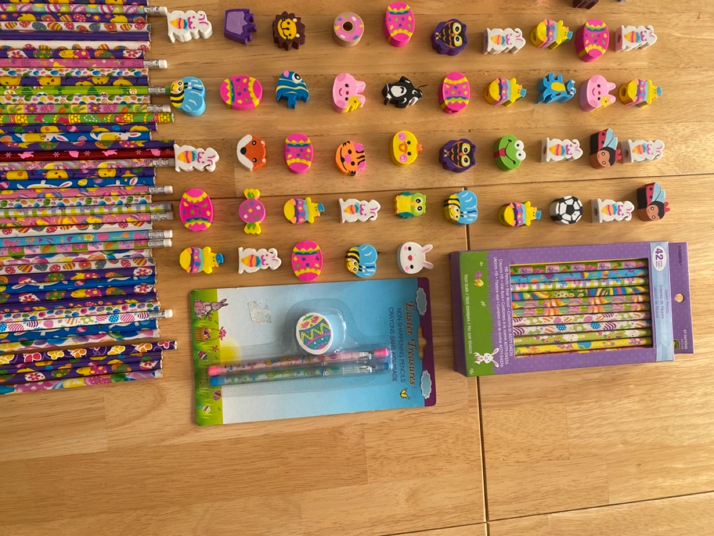 •”NEW” •Large lot of colourful Easter-themed pencils and erasers •Perfect for Easter baskets, classroom prizes, or party favours •Includes many different designs •90 Loose pencils •Pkg of 42 pencils in box •105 loose erasers •1 pkg non-sharping pencil/eraser(see pic) •smoke-free, pet-free environment **LOCATION: Jane & Lawrence**