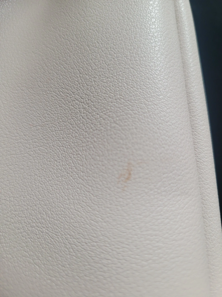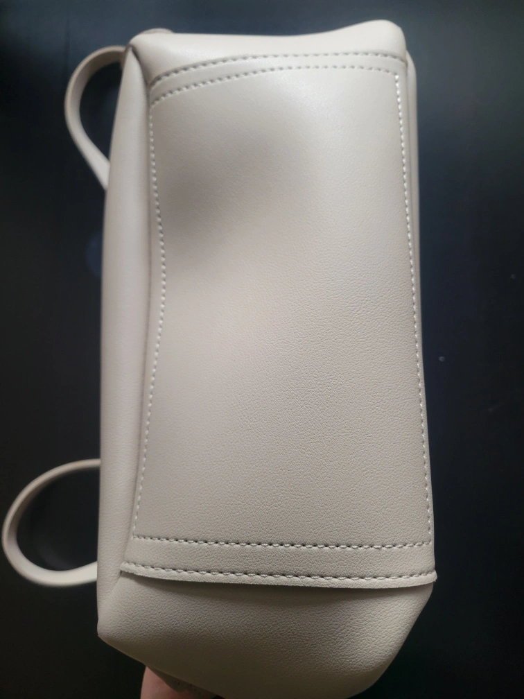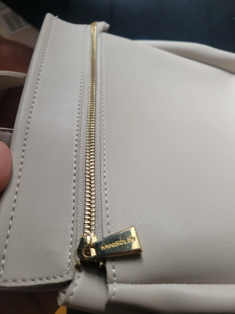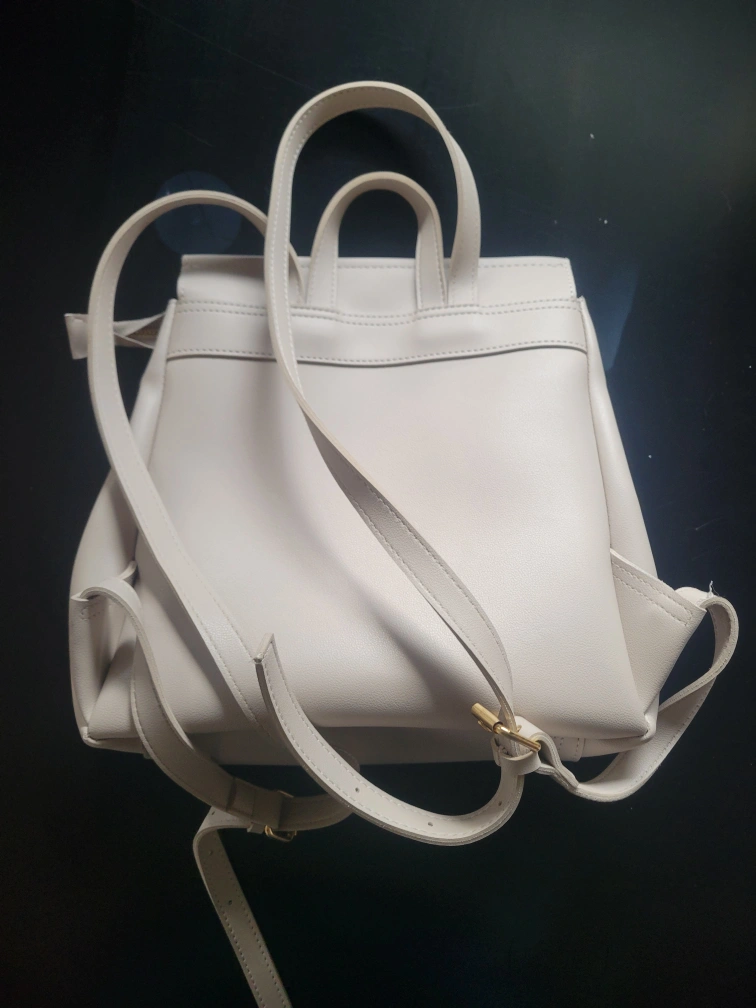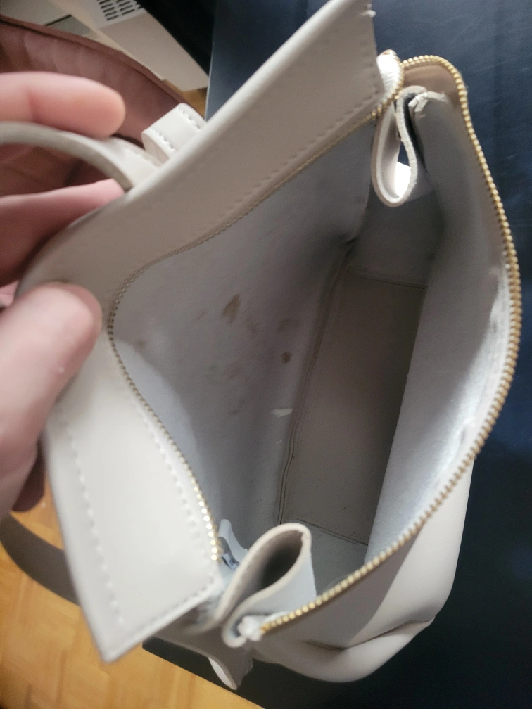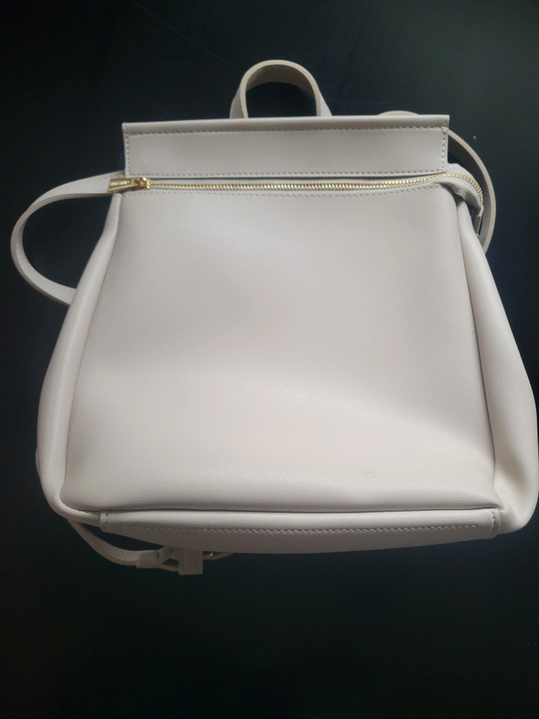 Stylish beige backpack. Features top handles and adjustable shoulder straps. Gold zipper. Small mark on the side. Few stains inside the backpack.