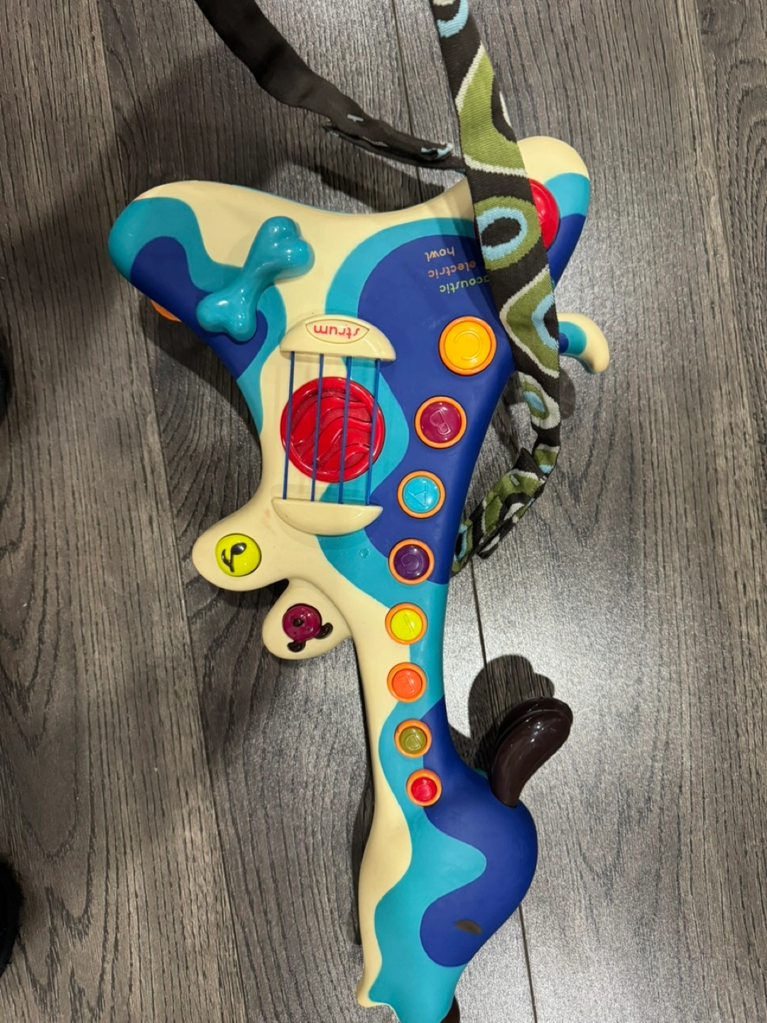 Fun musical toy for toddlers. Features colourful buttons and a dog design. Includes a strap. Pre-owned.