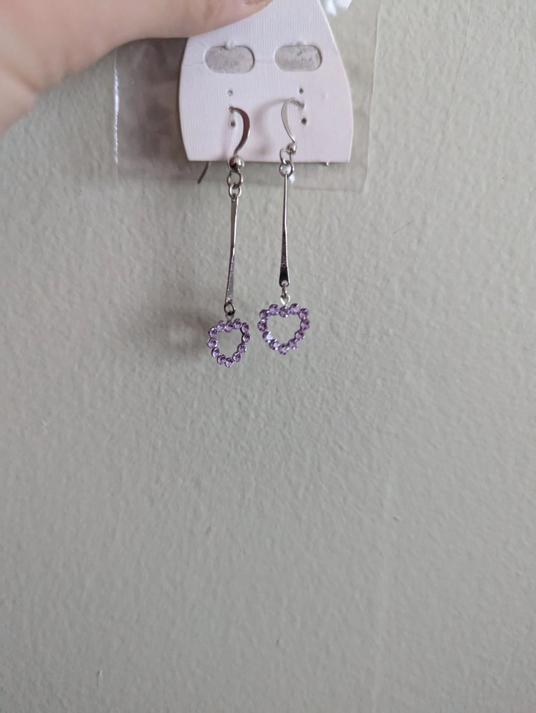 Pair of silver dangle earrings. Features a delicate, light purple heart charm. never used