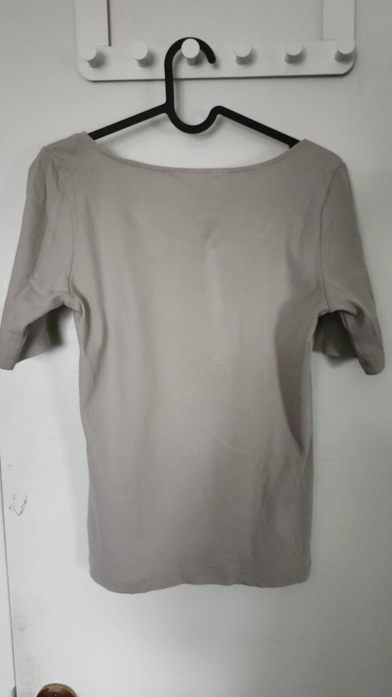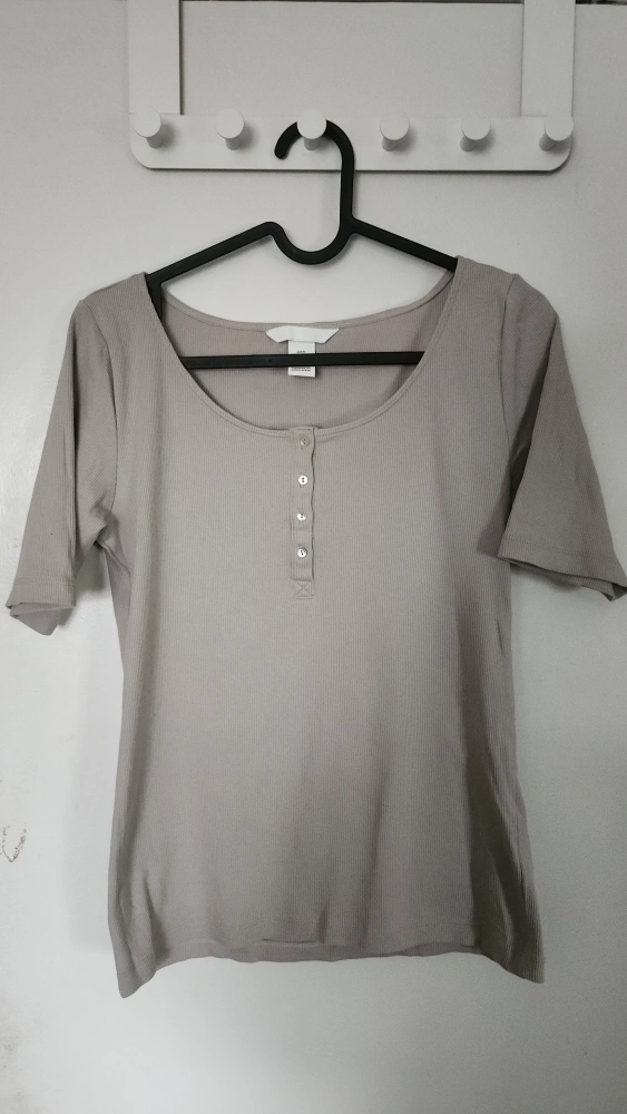 Ribbed taupe short sleeve top (it's a little warmer-coloured in person). Henley neckline w/ 4 buttons. Cotton blend Pick up/cash only :)