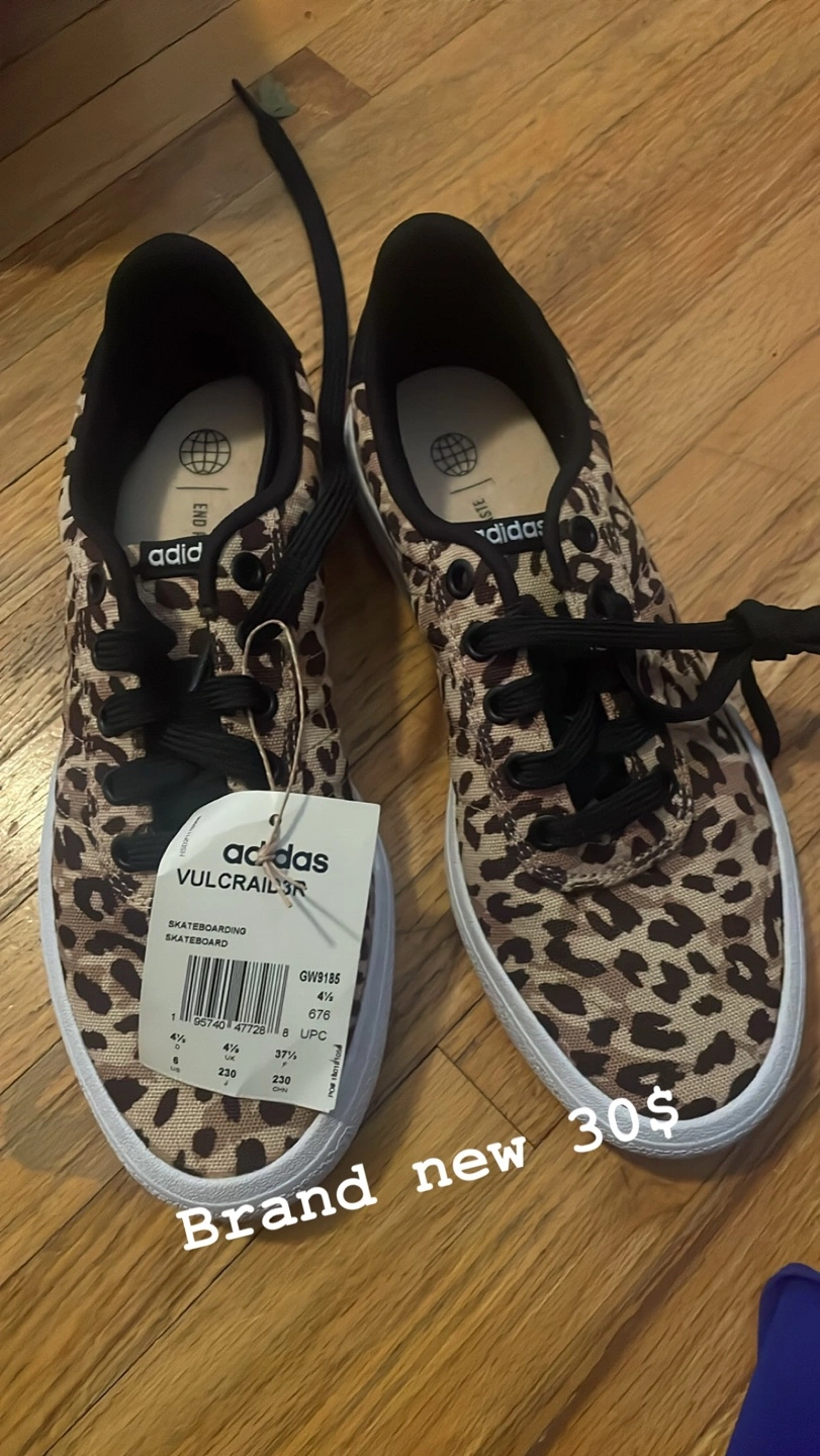 Brand new Adidas Vulcralil 3D skateboarding shoes. Size 4½. Leopard print design. $30.