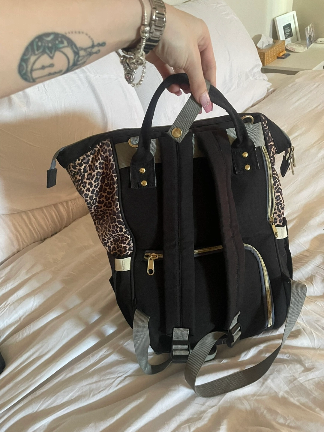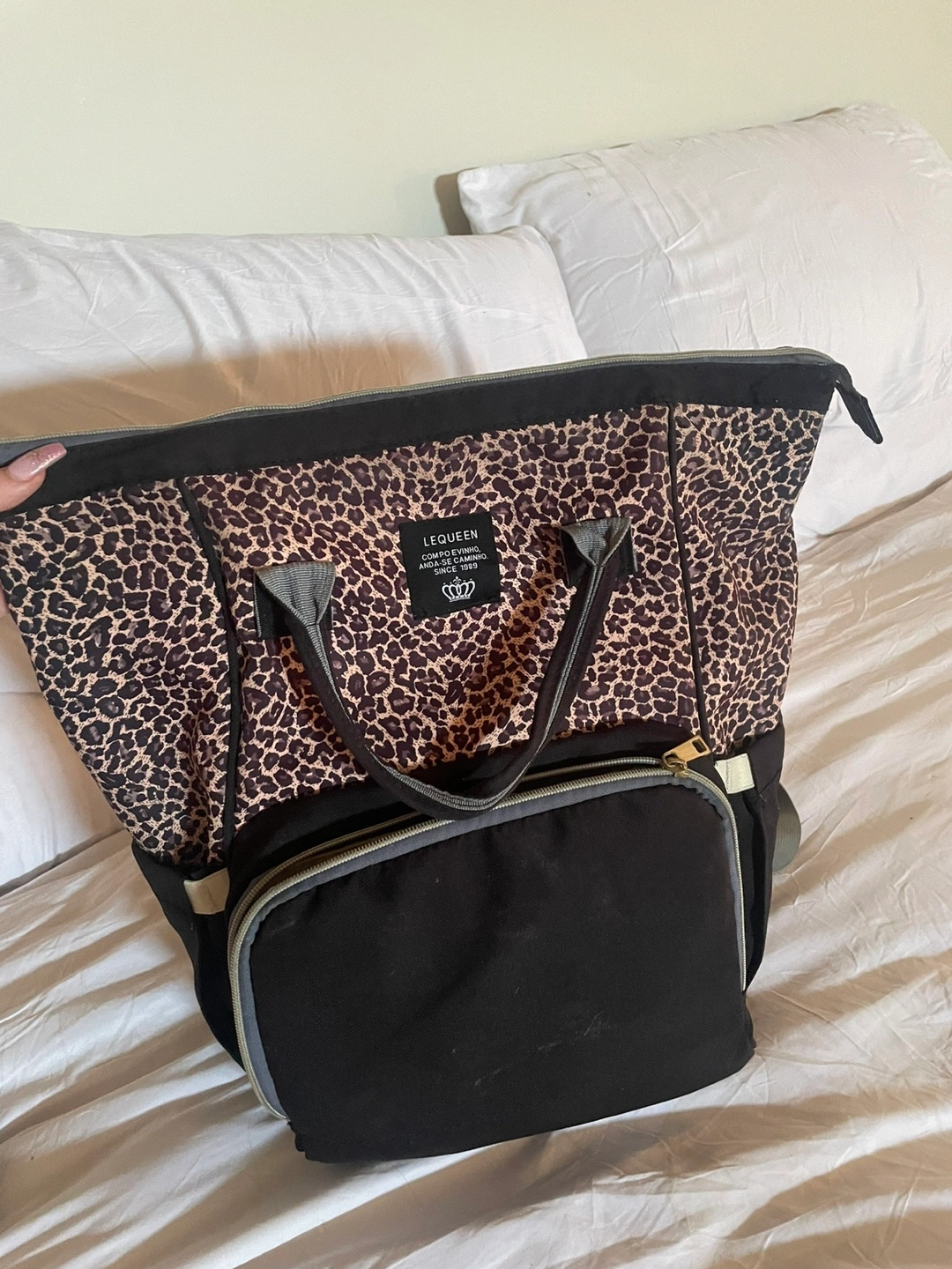 Stylish leopard print diaper bag. Multiple pockets and compartments. Great for carrying baby essentials. Backpack straps and top handles.