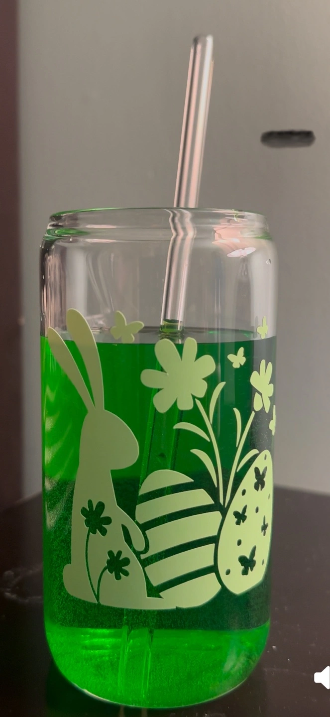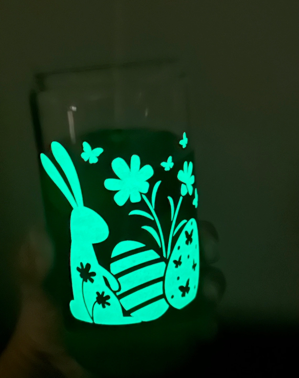 Cute glass featuring a bunny, flowers, and eggs. Glows in the dark. Includes a glass straw. Perfect for spring.