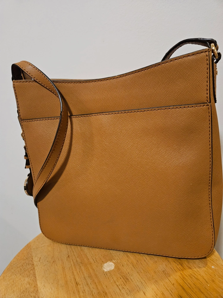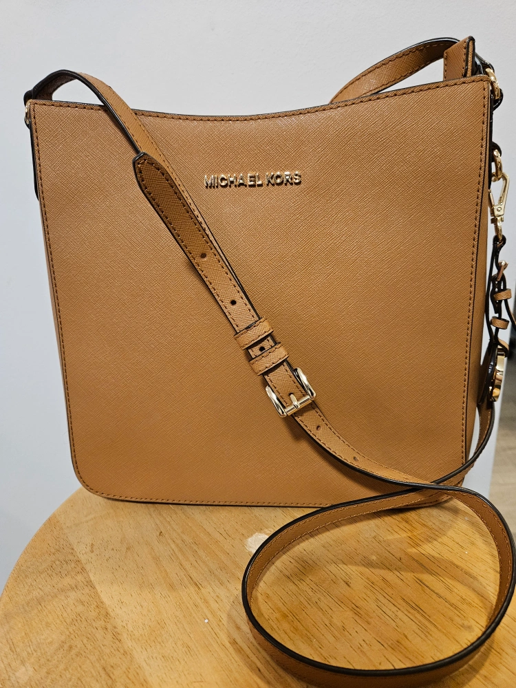 New MK tan leather crossbody bag. Adjustable strap. Multiple interior pockets. Gold-tone hardware. Excellent new condition. Asking $110 or best offer. Pick up in Markham. Thank you for checking my post! Have a great day!