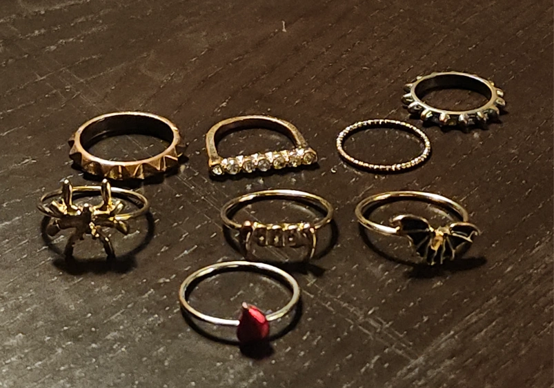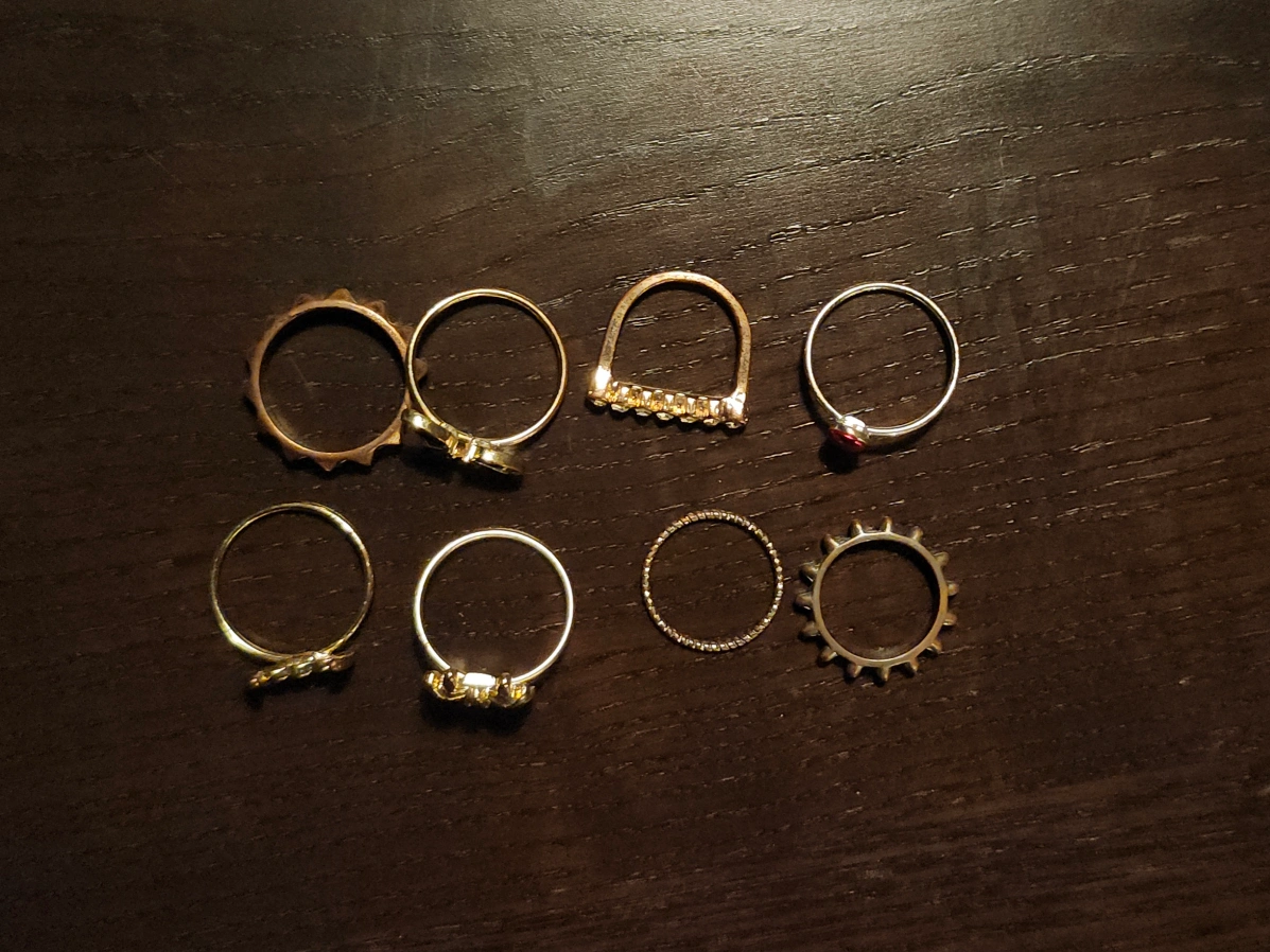 8 rings, they vary a bit in sizes. Some of them are Halloween-themed. Paint on the red one is a bit chipped. They're just costume jewelry, so $2.50 for all of them Pick up/cash only :)