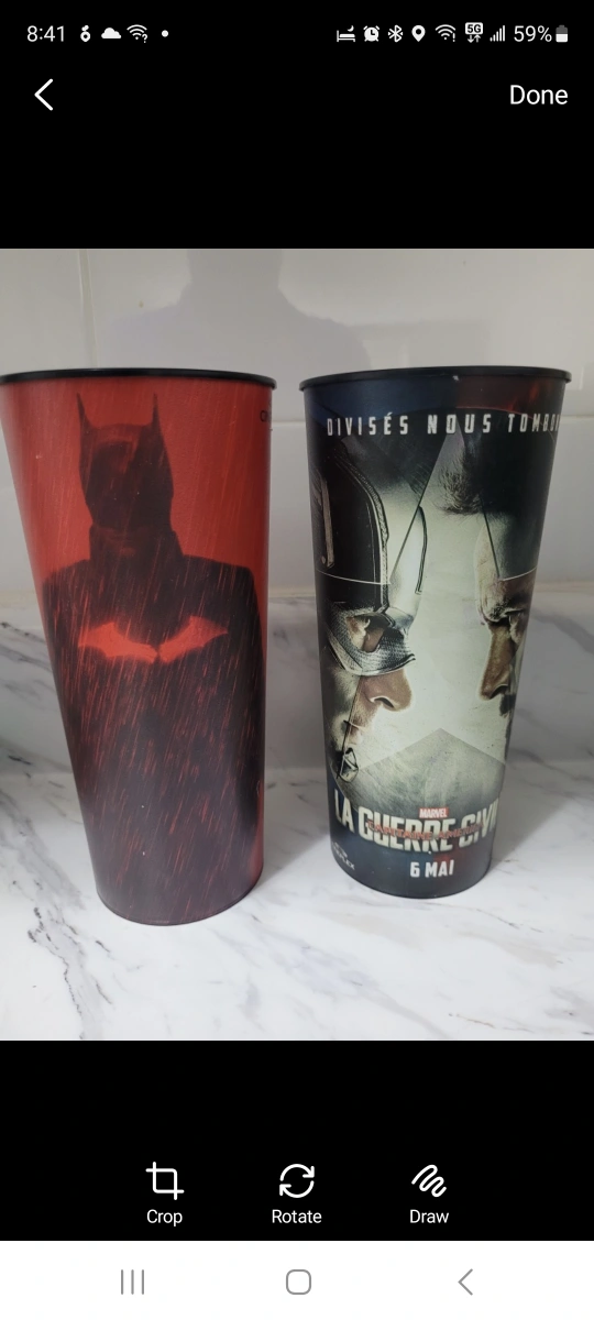 Pair of collectible movie cups. One features Batman v Superman imagery, the other Captain America Civil War. Large size, ideal for movie snacks or display.