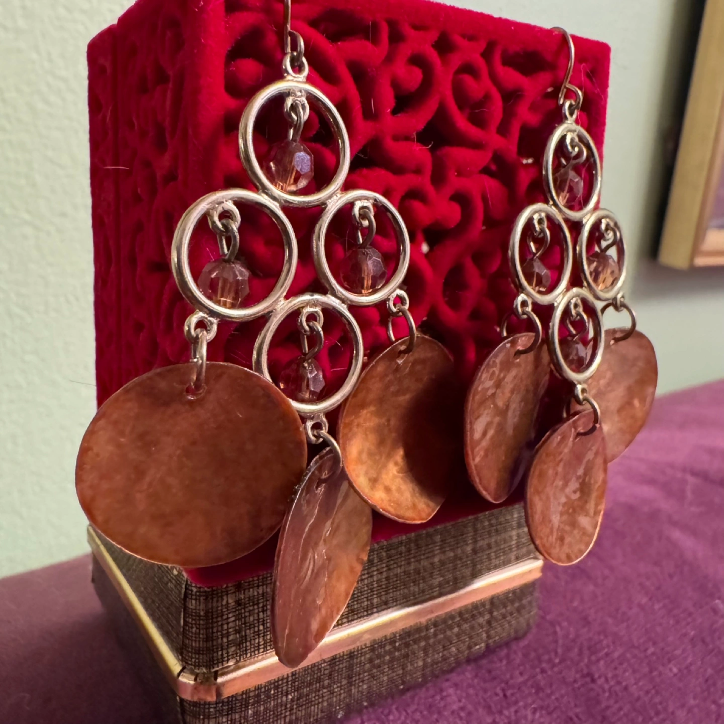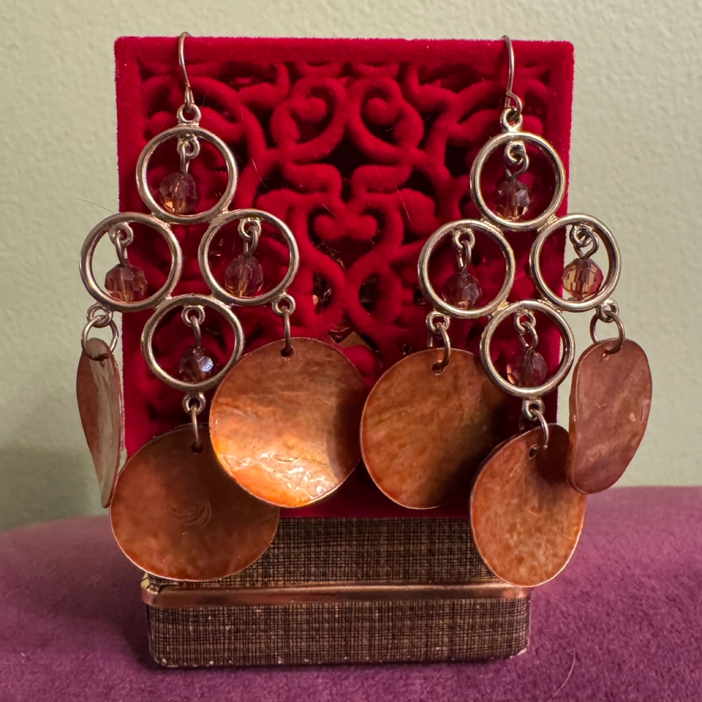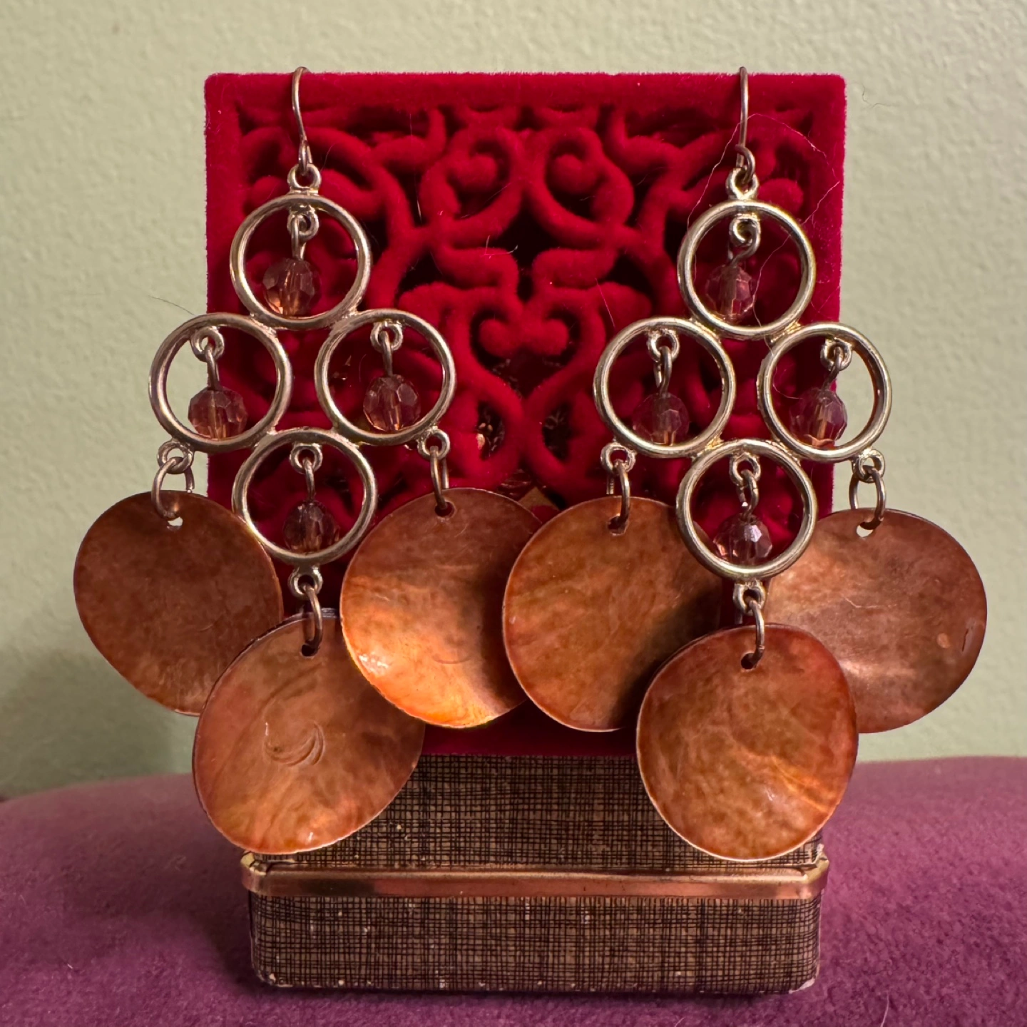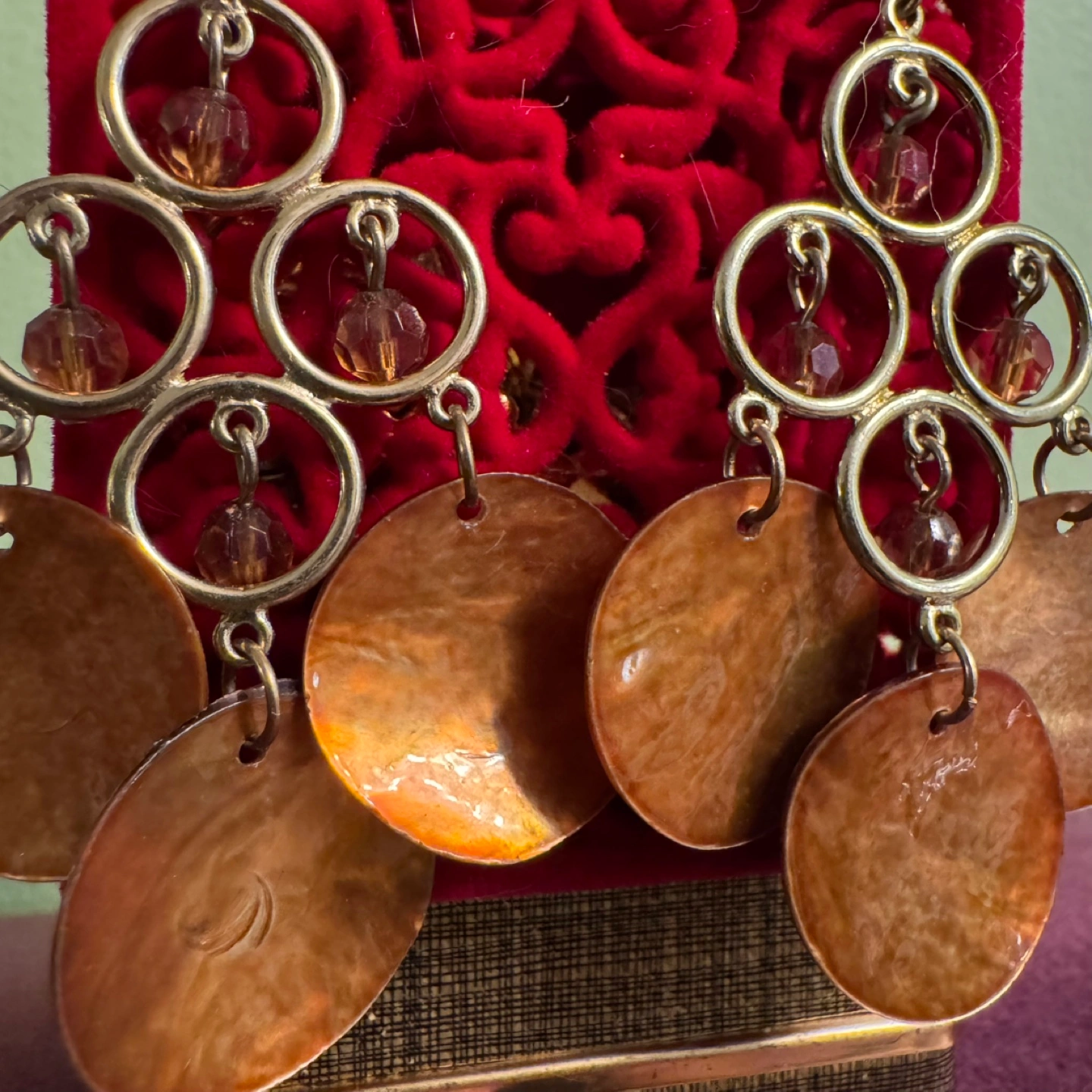 Beautiful statement earrings. Features polished natural shell discs and gold-tone metalwork. Crystals hang between the circles. Unique and eye-catching. This item is in lovely vintage condition. Please see photos and let me know if you have any questions.