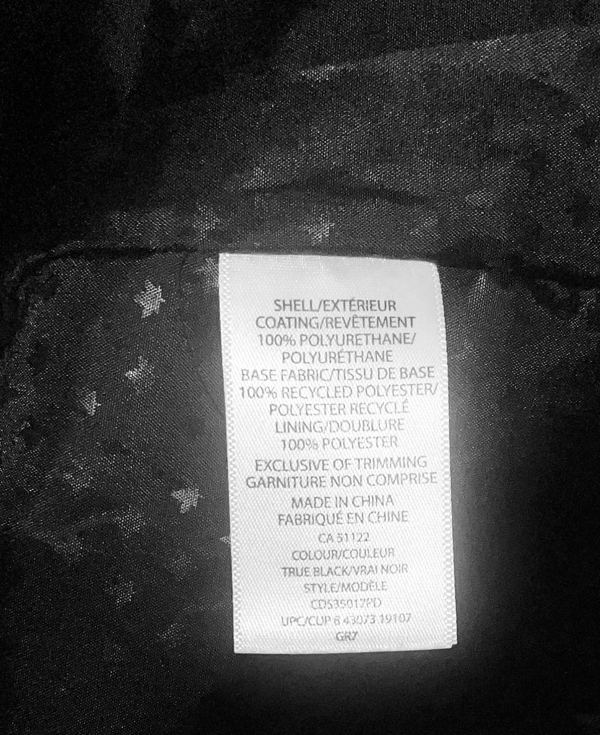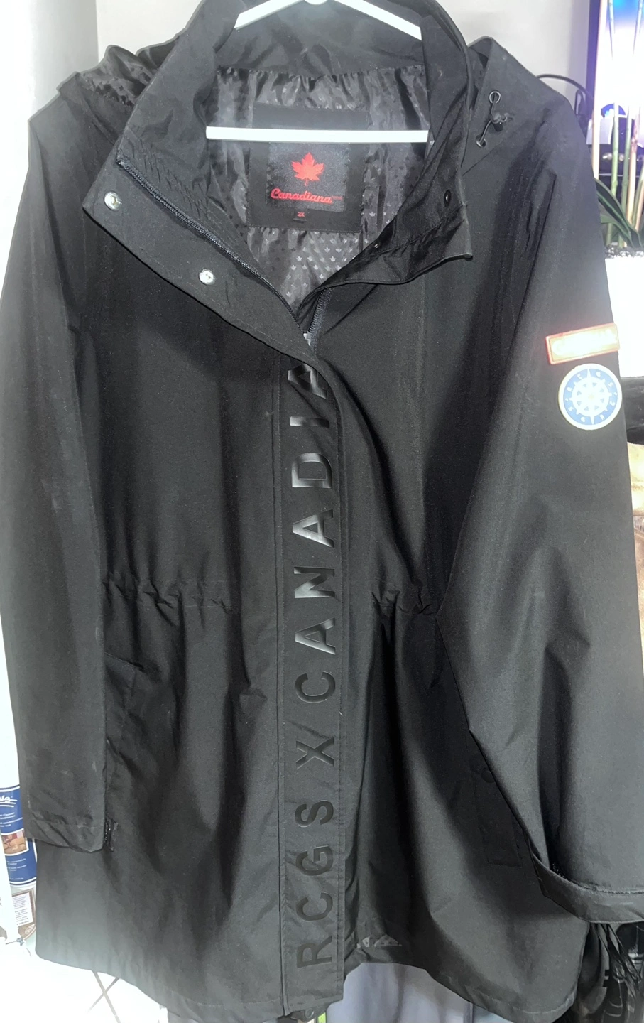 Unisex size 2X black hooded jacket. Long length. Features a vertical logo on the sleeve. Recycled polyester. Made in China.