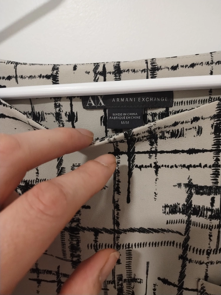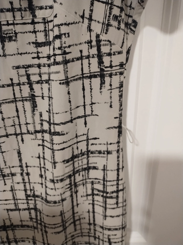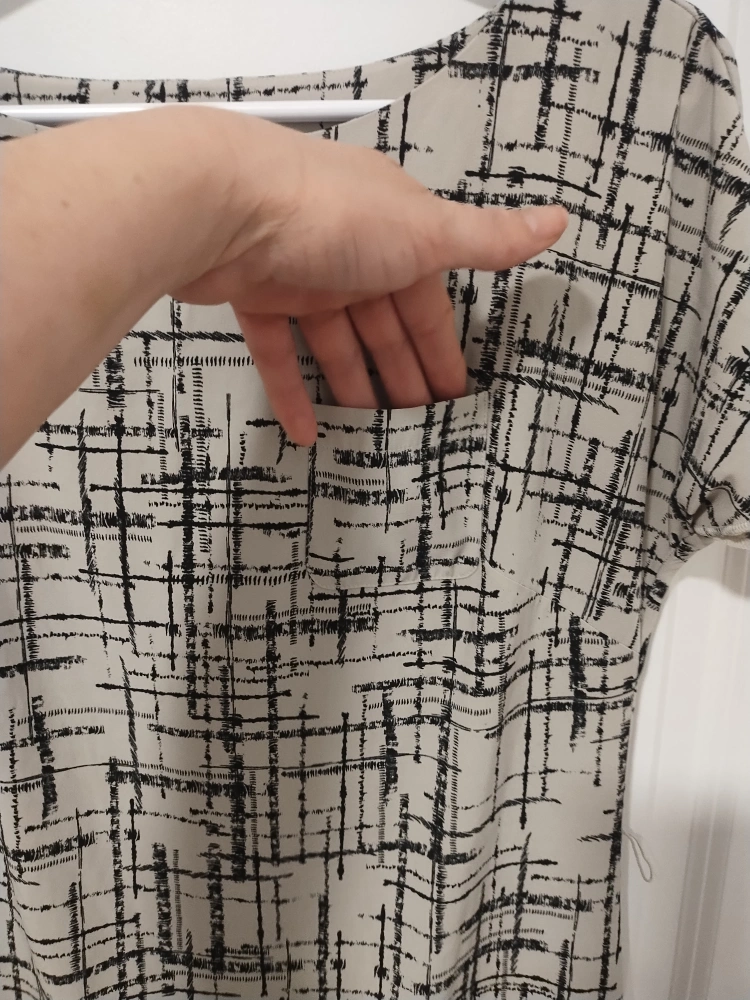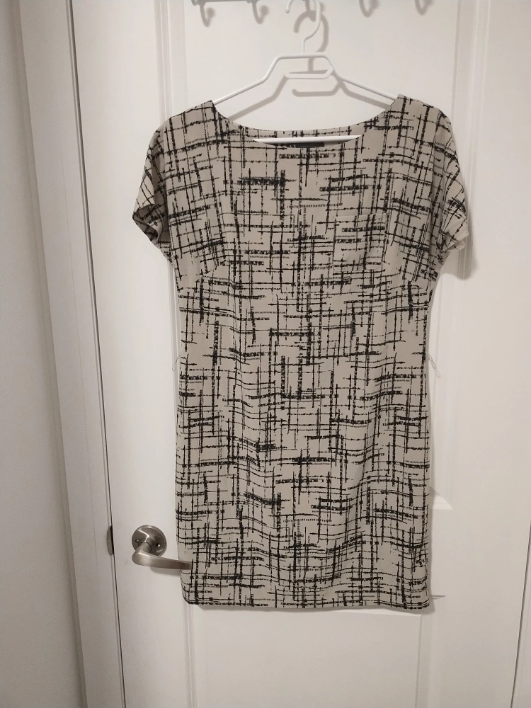 Short sleeve, knee-length dress. Beige background with a black abstract print. Round neckline. Side seam pockets. Made in China. Like new