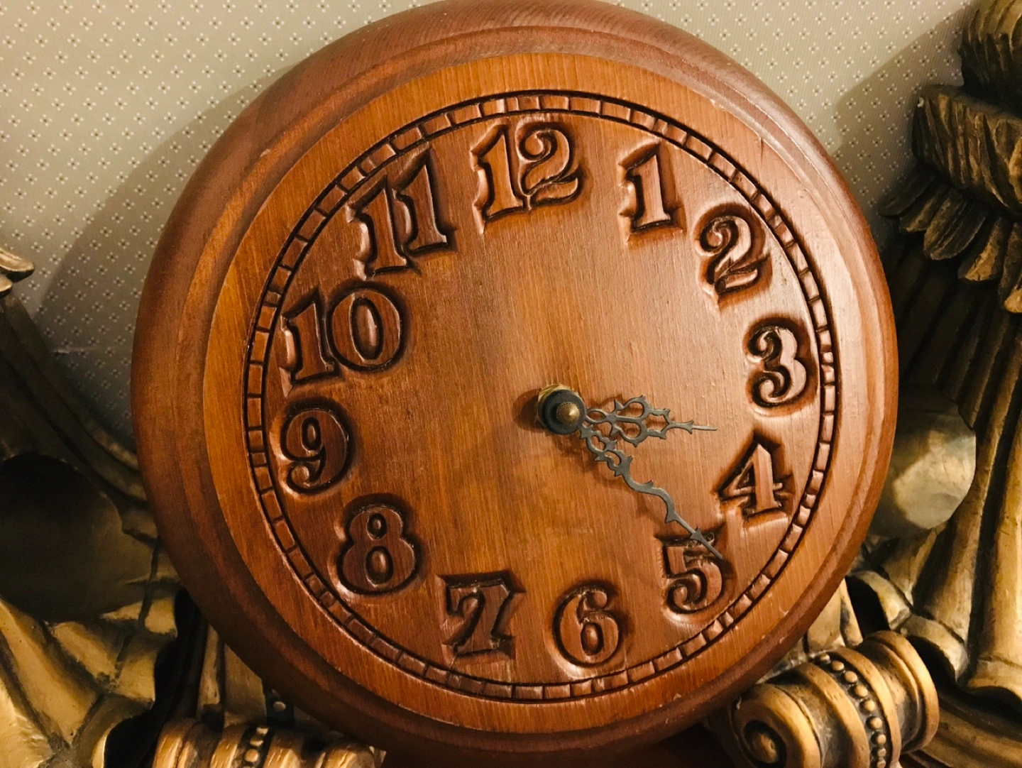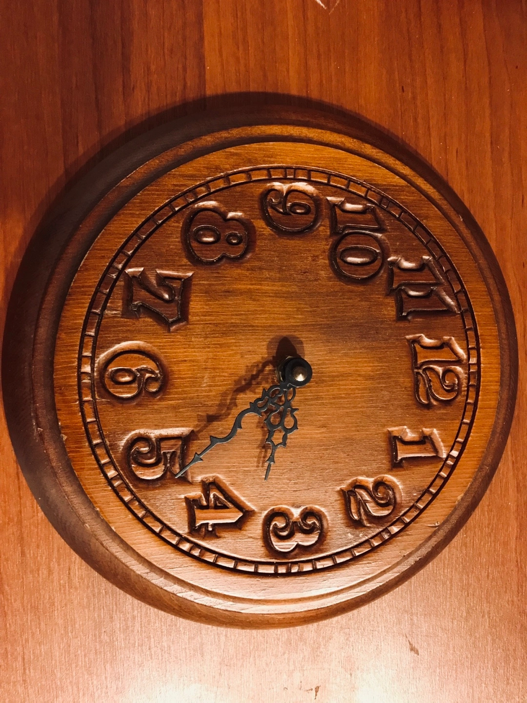 Beautiful round wooden clock. Intricate carvings. Dark brown wood. Analog clock face. Looks great on a wall.