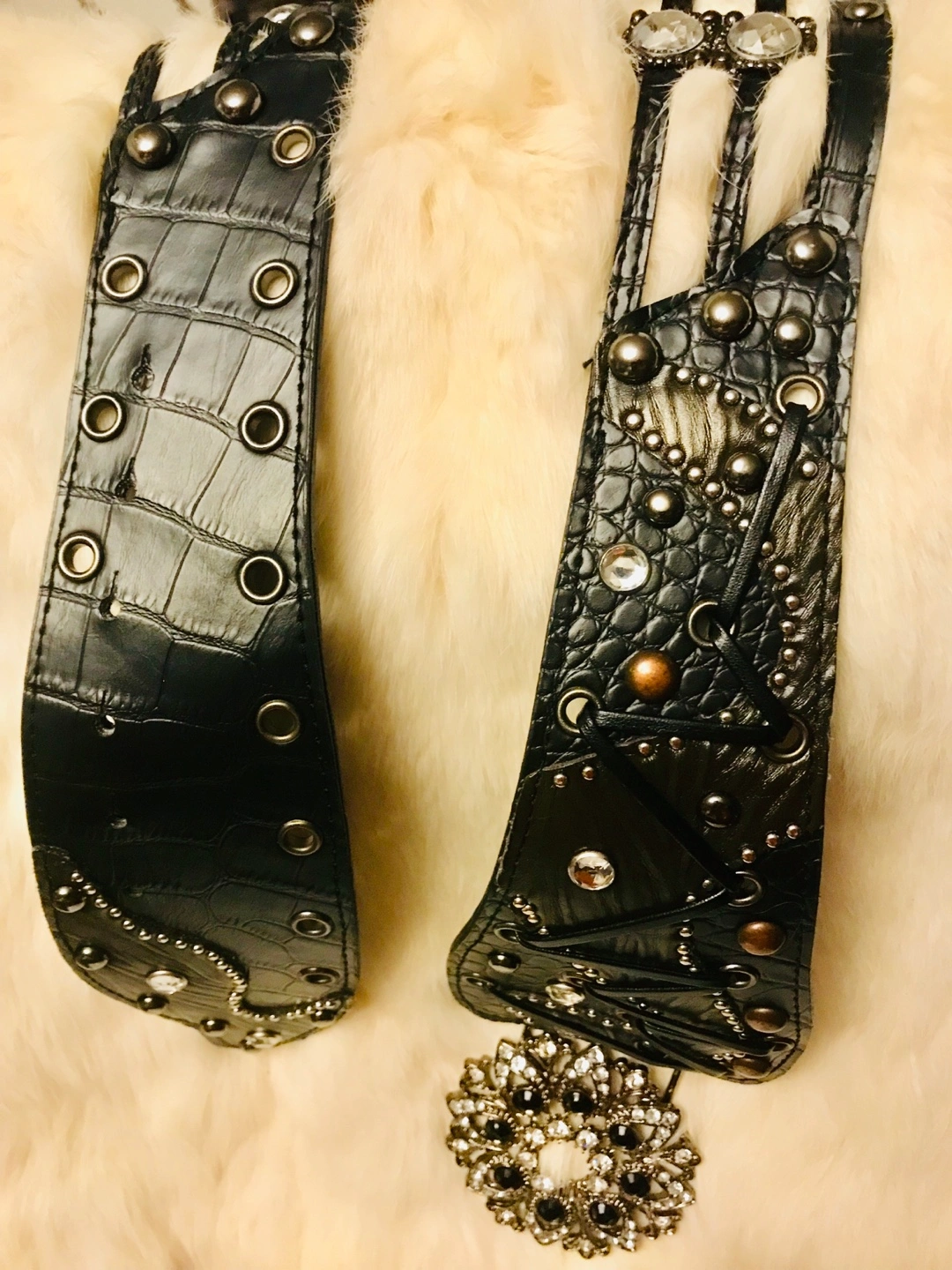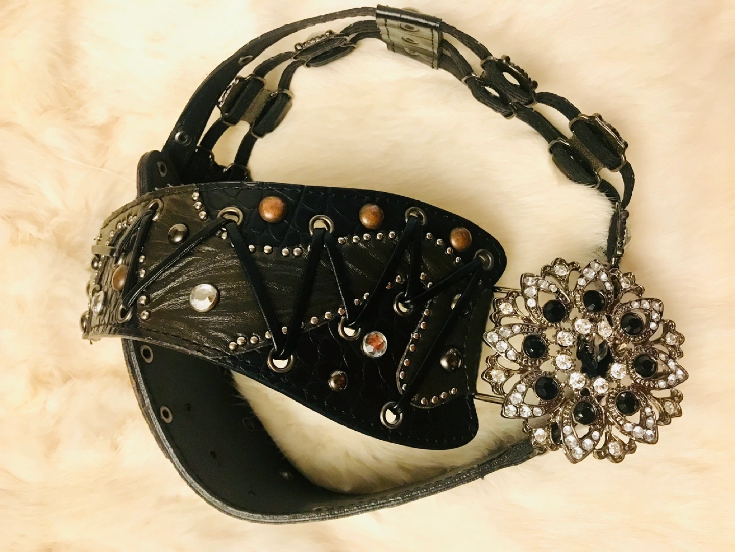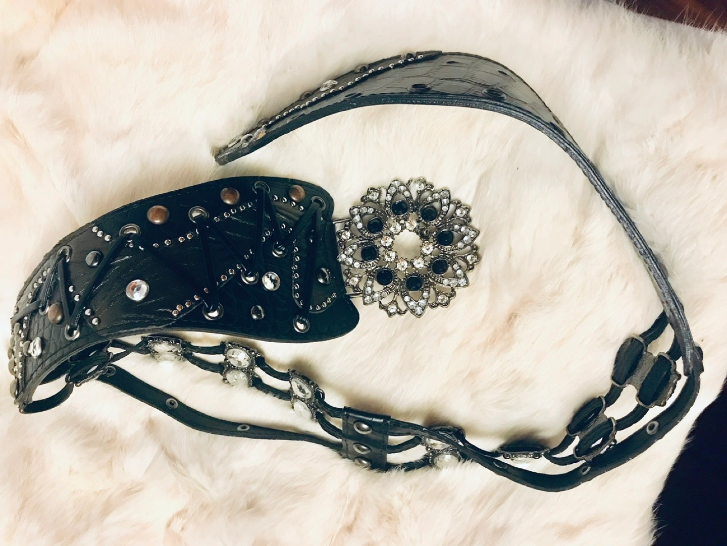 Wide black leather belt. Features rhinestones, studs, and metal accents. Ornate floral rhinestone buckle. Eye-catching design.