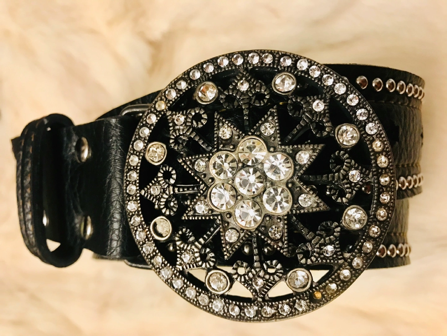 Gorgeous black belt. Features an ornate, circular buckle encrusted with sparkling crystals. Belt is studded with metal accents. Beautiful statement piece.