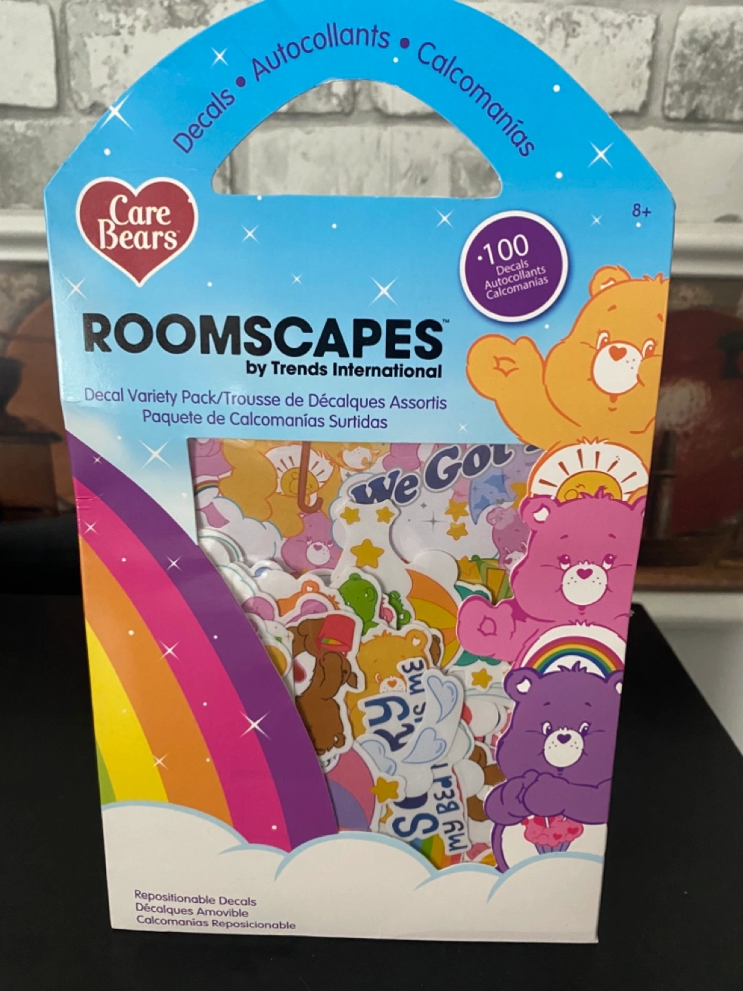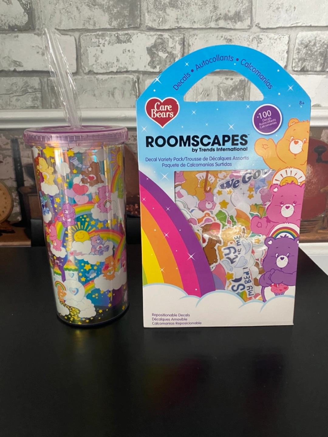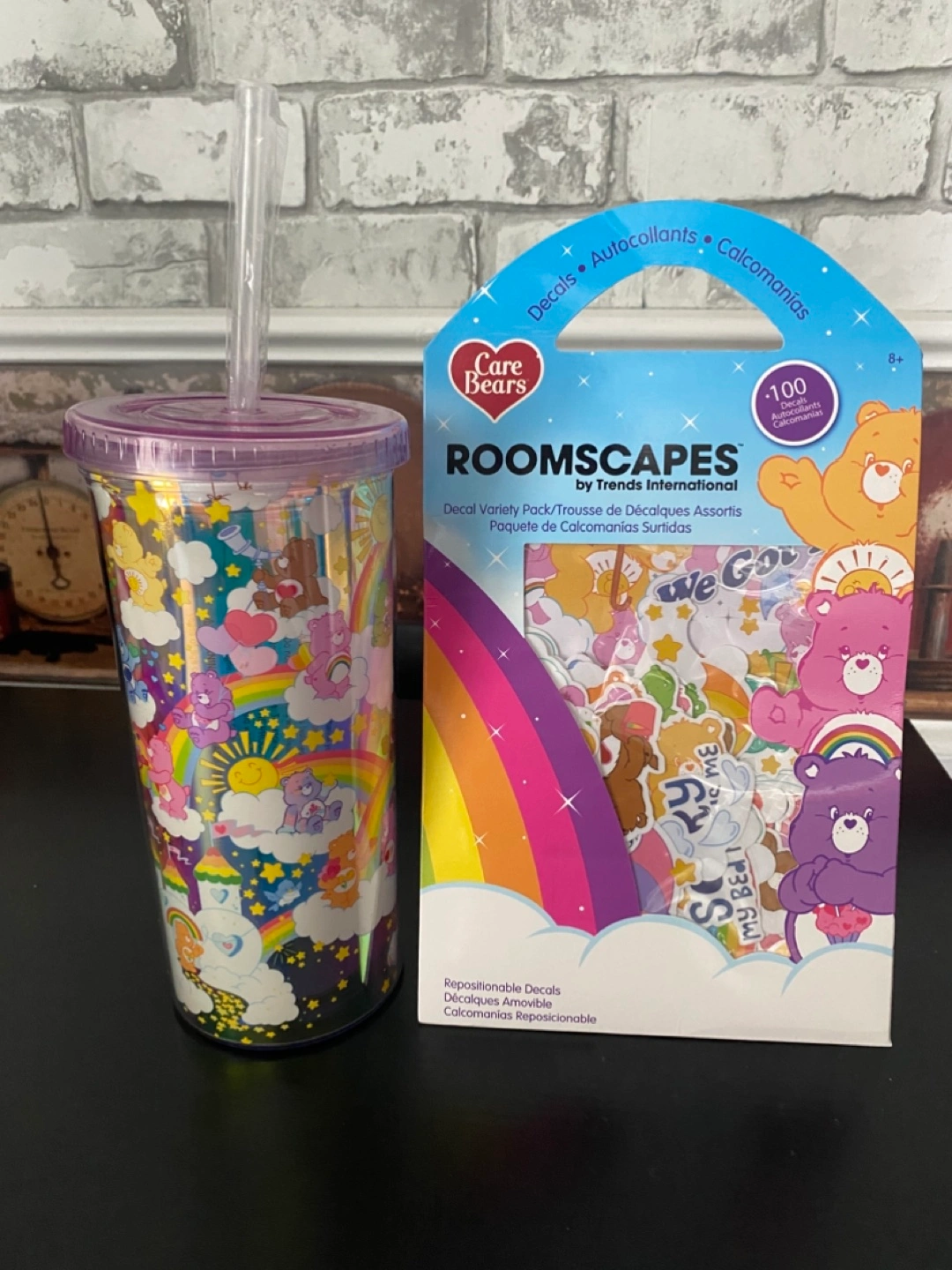 Clear plastic Care Bears 20 oz tumbler. Includes straw still wrapped with tag for $12.99 Package of 100 Care Bears RoomScapes decals. Easy to apply and remove. All new! Excellent Condition! All for $10 Cash and pick up only, Cawthra and Lakeshore area in Mississauga.