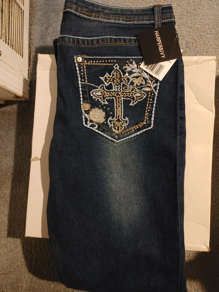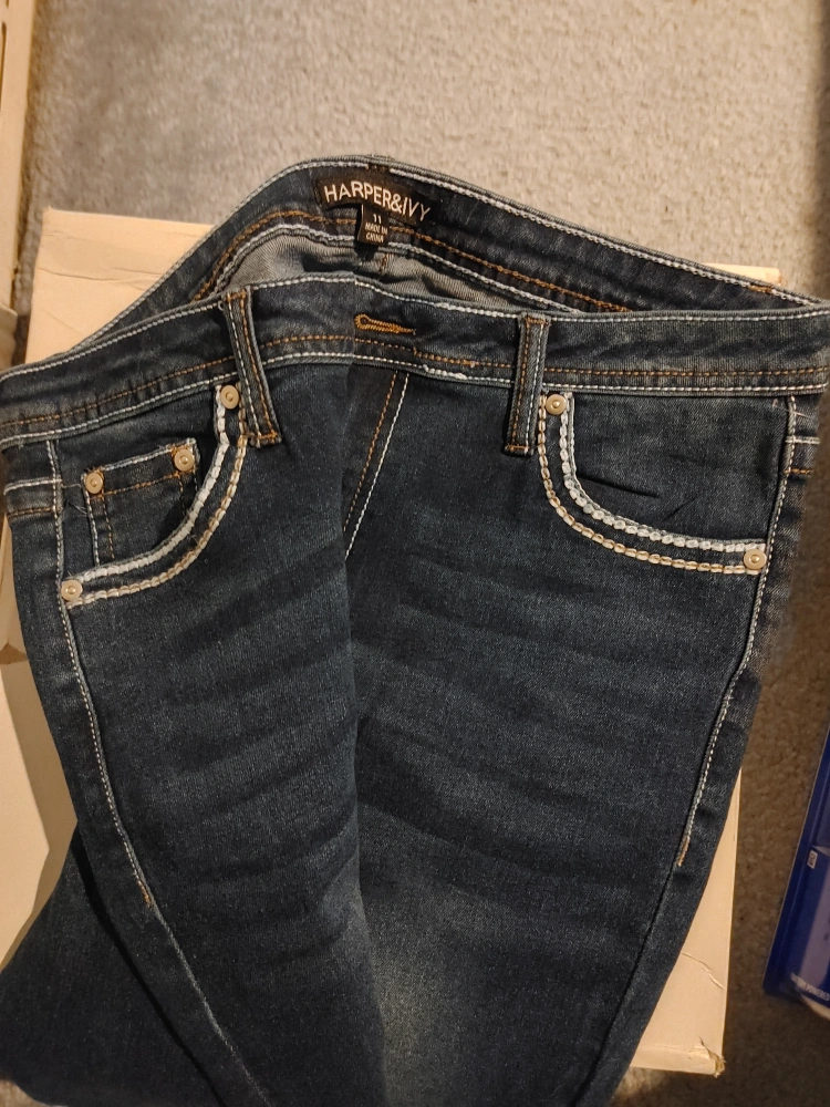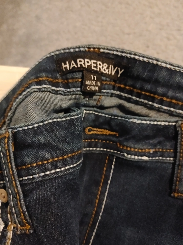 🥕HARPER AND IVY DENIM JEANS 🥕LADIES SIZE 11 🥕BRAND NEW WITH TAGS 🥕RETAIL PRICE OF ABOUT $55 Soft denim construction Straight hem Button & zipper front 2 open pockets at front, 2 flat back pockets Contrast thread stitching Rhinestone/embroidery design at back pockets 🥕FITTING: PLEASE SEE SIZING CHART IN PHOTO. 31-in. inseam 8 1/4-in. leg opening Flared leg opening Midrise sits on the high hip Relaxed fit through the hip and thigh Contour waistband I AM LOCATED IN THE YONGE & STEELES AREA FOR PICKUP.