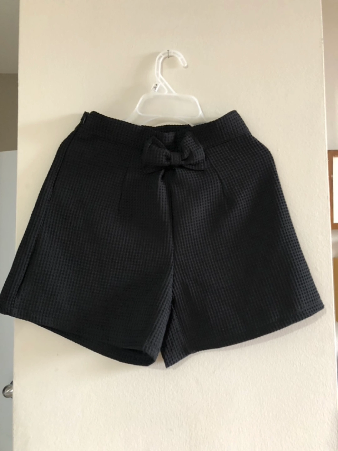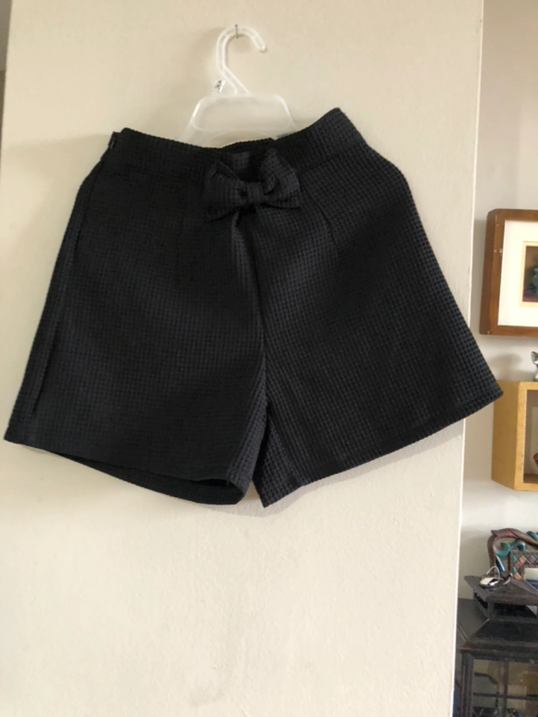 Girl's black shorts. Waffle-textured fabric. Features a cute bow at the waist. Good condition.