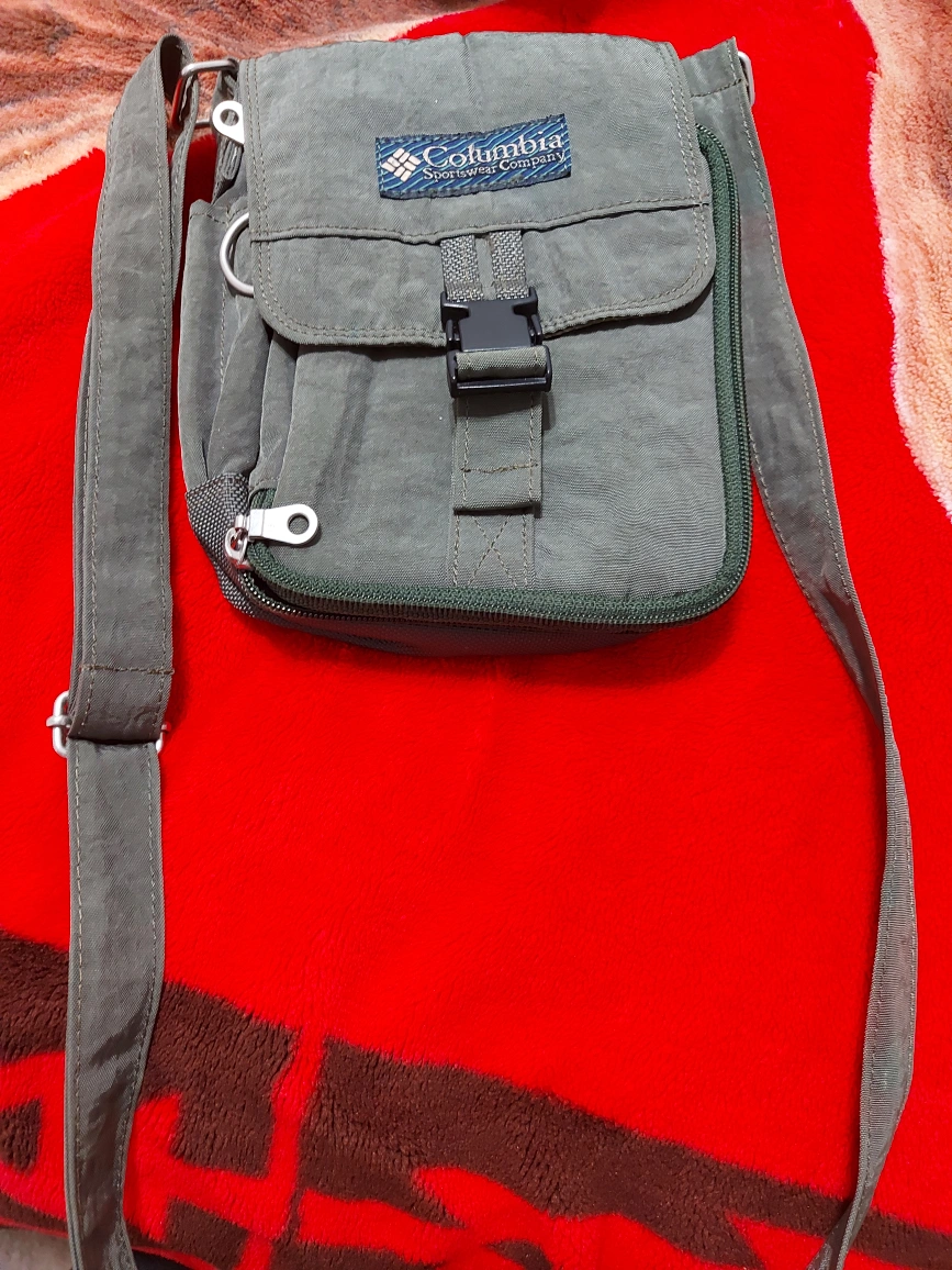 Small olive-green crossbody bag. Features adjustable strap and zipper closure. Excellent for everyday use.