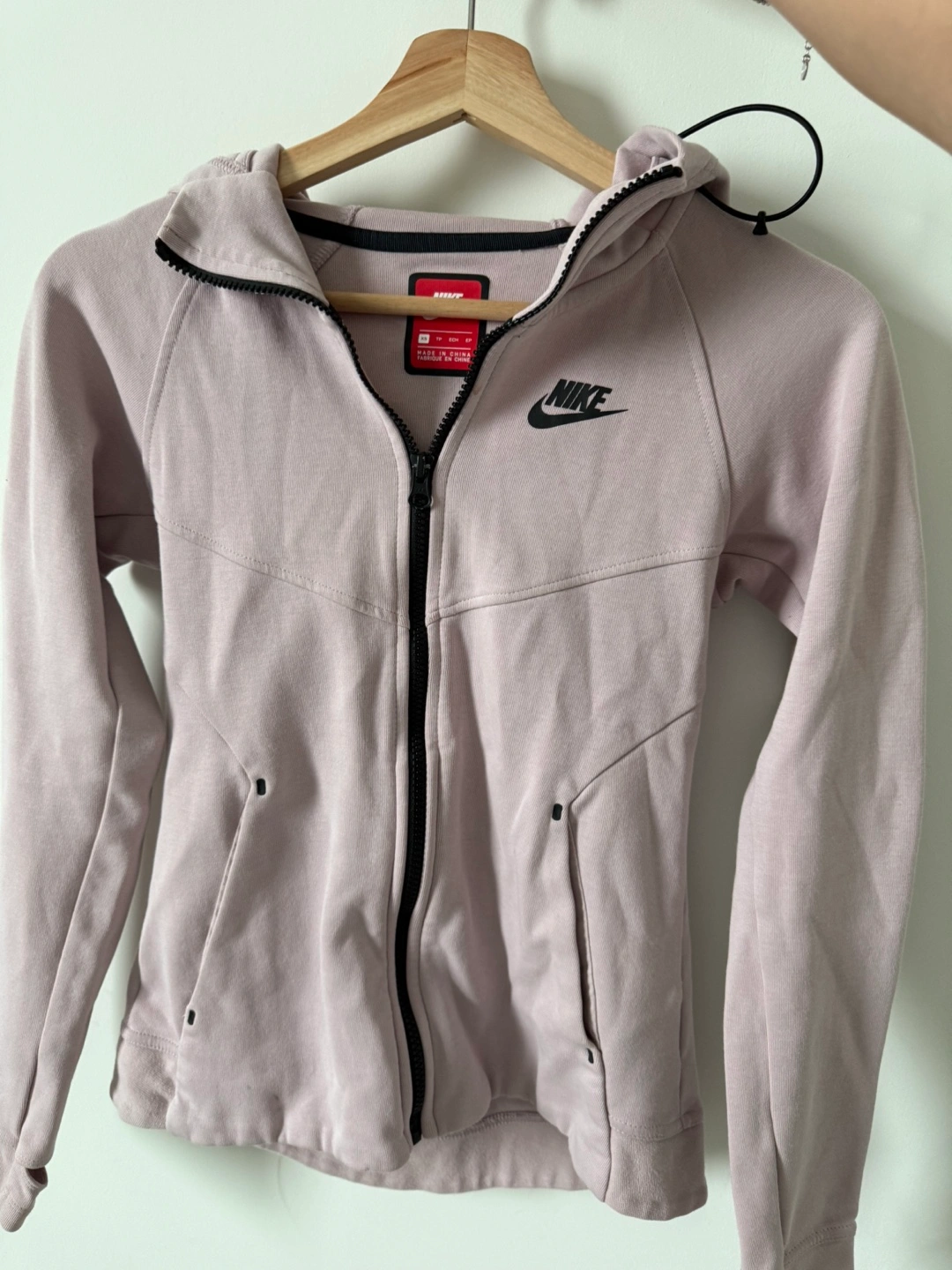 Pale pink Nike Tech Fleece zip-up hoodie. Features a full zip closure, a hood, and long sleeves. Good condition.