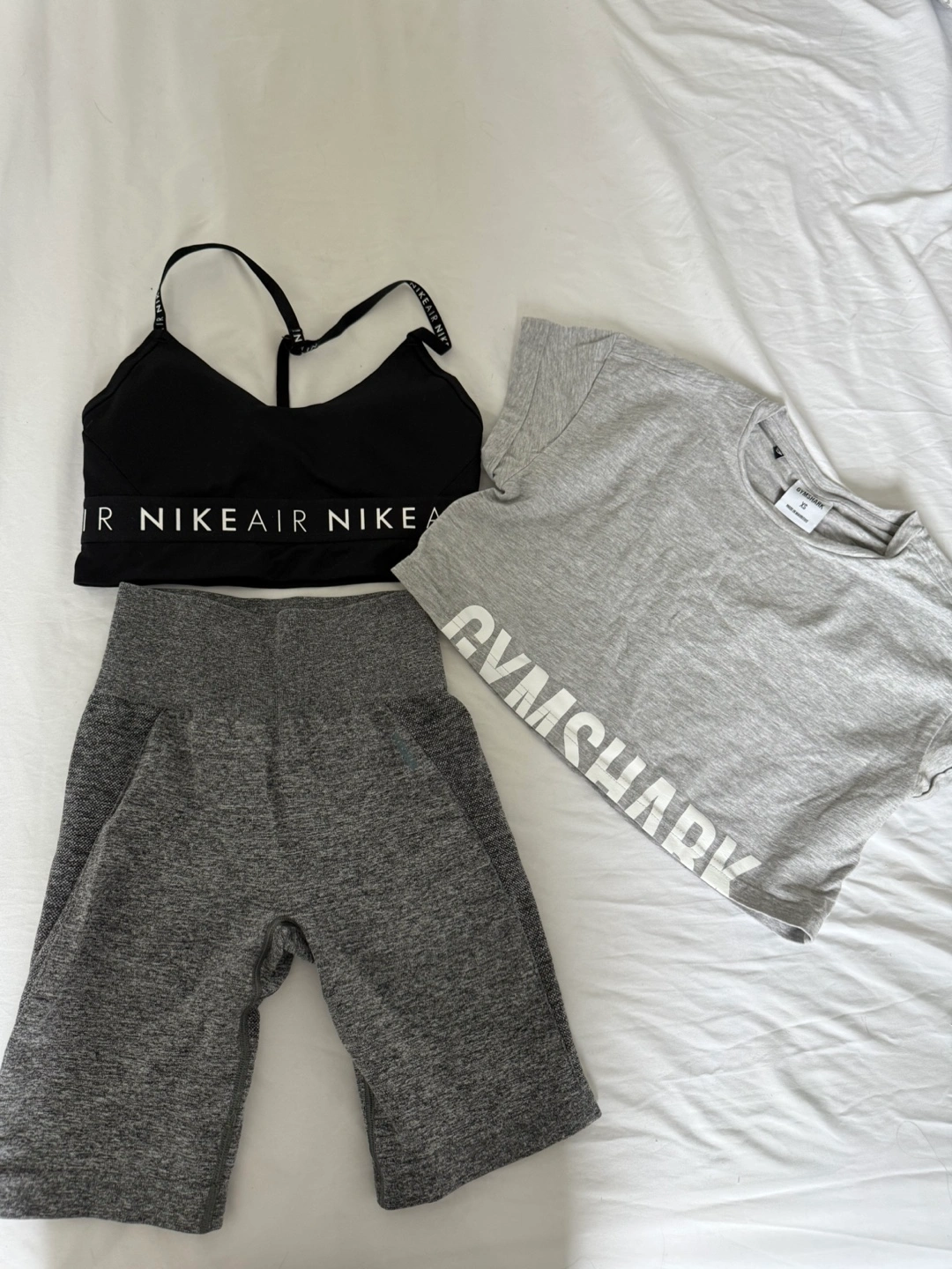 Women's workout clothing bundle. Includes a black Nike sports bra and a grey Gymshark cropped t-shirt and biker shorts. Perfect for the gym or casual wear. All fit XS.