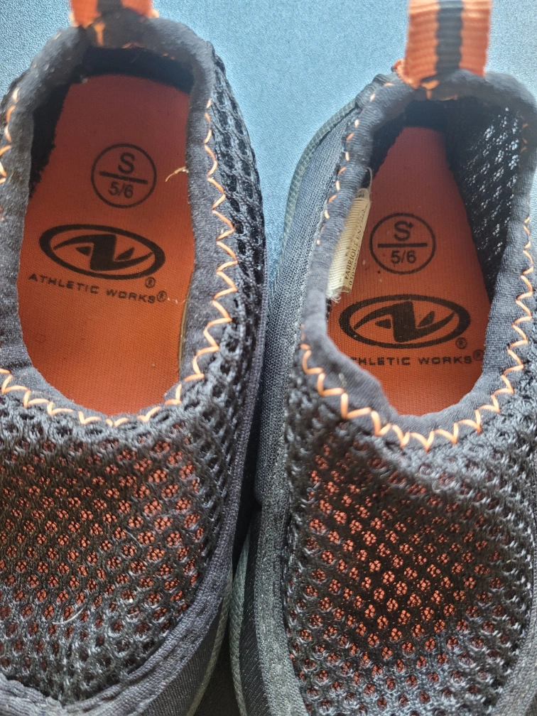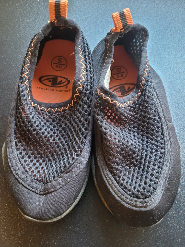Black water shoes. Size small, 5/6. Slip-on style. Mesh upper. Good for water activities, beach, lake or Waterpark. free with any other purchase