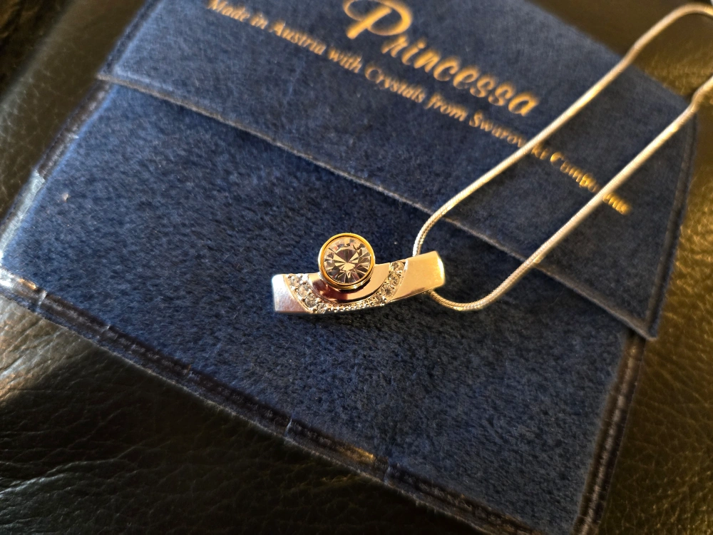 Elegant silver tone necklace. Features a central clear stone accented with smaller clear stones. New, never worn. 15 inch chain.