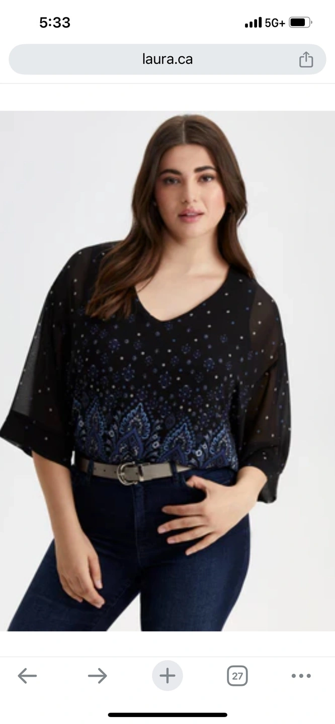 Women's black blouse. Features blue paisley pattern. Sheer sleeves. V-neck. Fits loose.