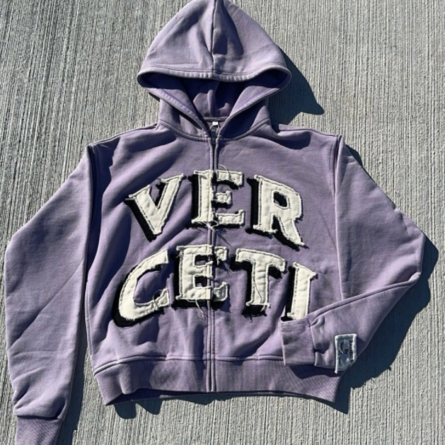 Purple zip-up hoodie. Features a large Verceti logo on the front. Long sleeves, cropped fit. Brand new condition.