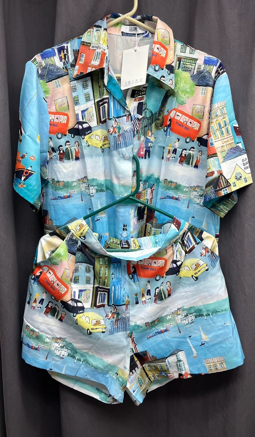 LALUNE set. Short sleeve button-up shirt and coordinating shorts. Cute town scene print. Lightweight fabric.