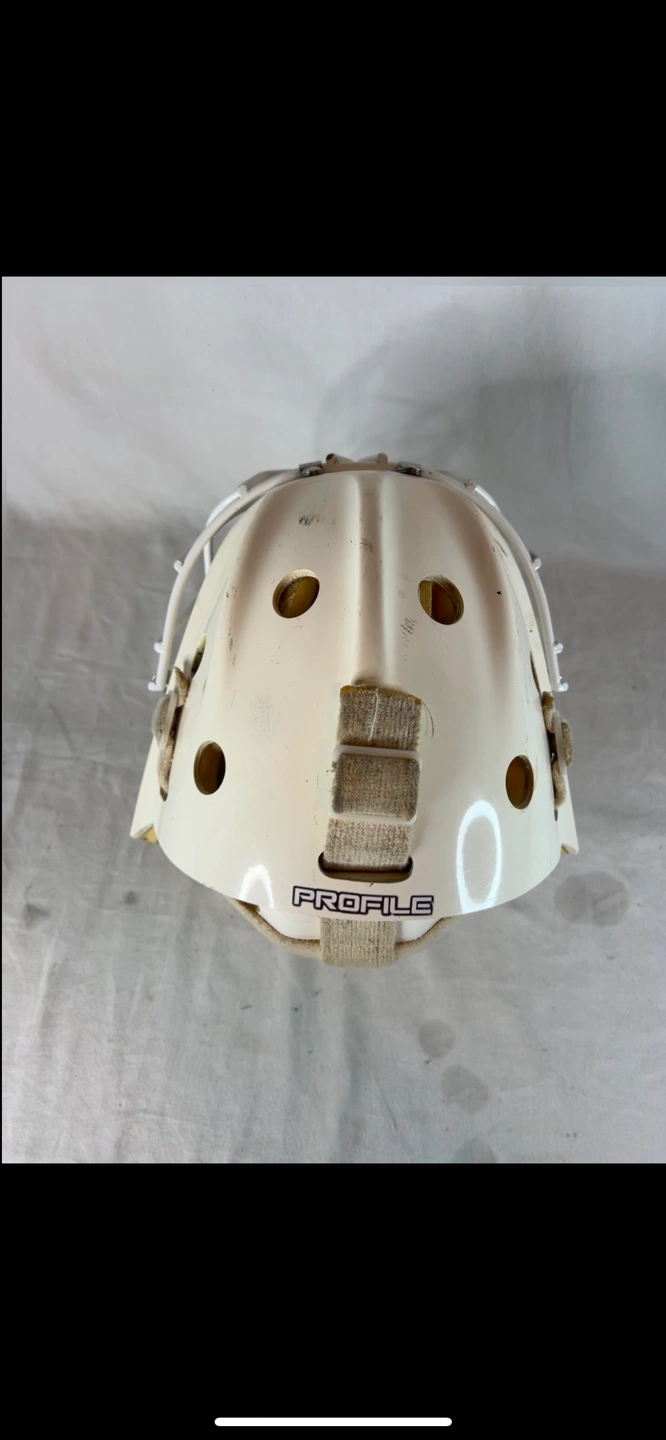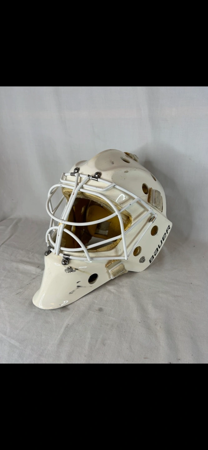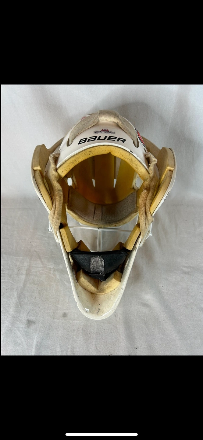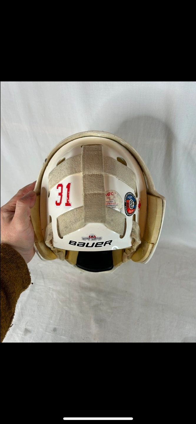 White goalie mask. Number 31. Shows wear. Bauer branding visible. Profile branding also visible.