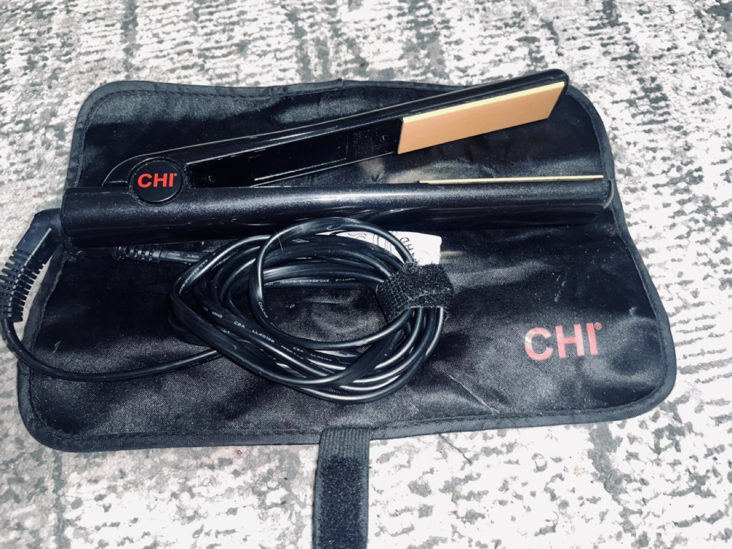 Black CHI flat iron, includes power cord and protective carrying case. Gold-toned plates. Pre-owned.