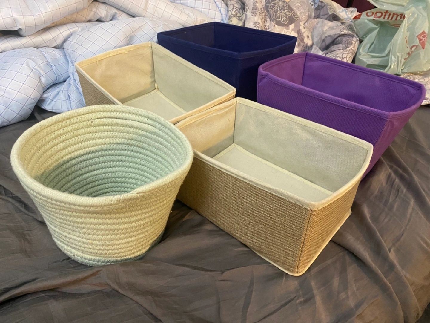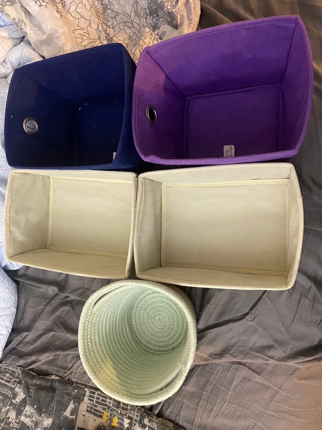 Four rectangular fabric storage bins in navy, purple and beige. One pale green rope storage basket. Great for organizing closets, shelves, or drawers.