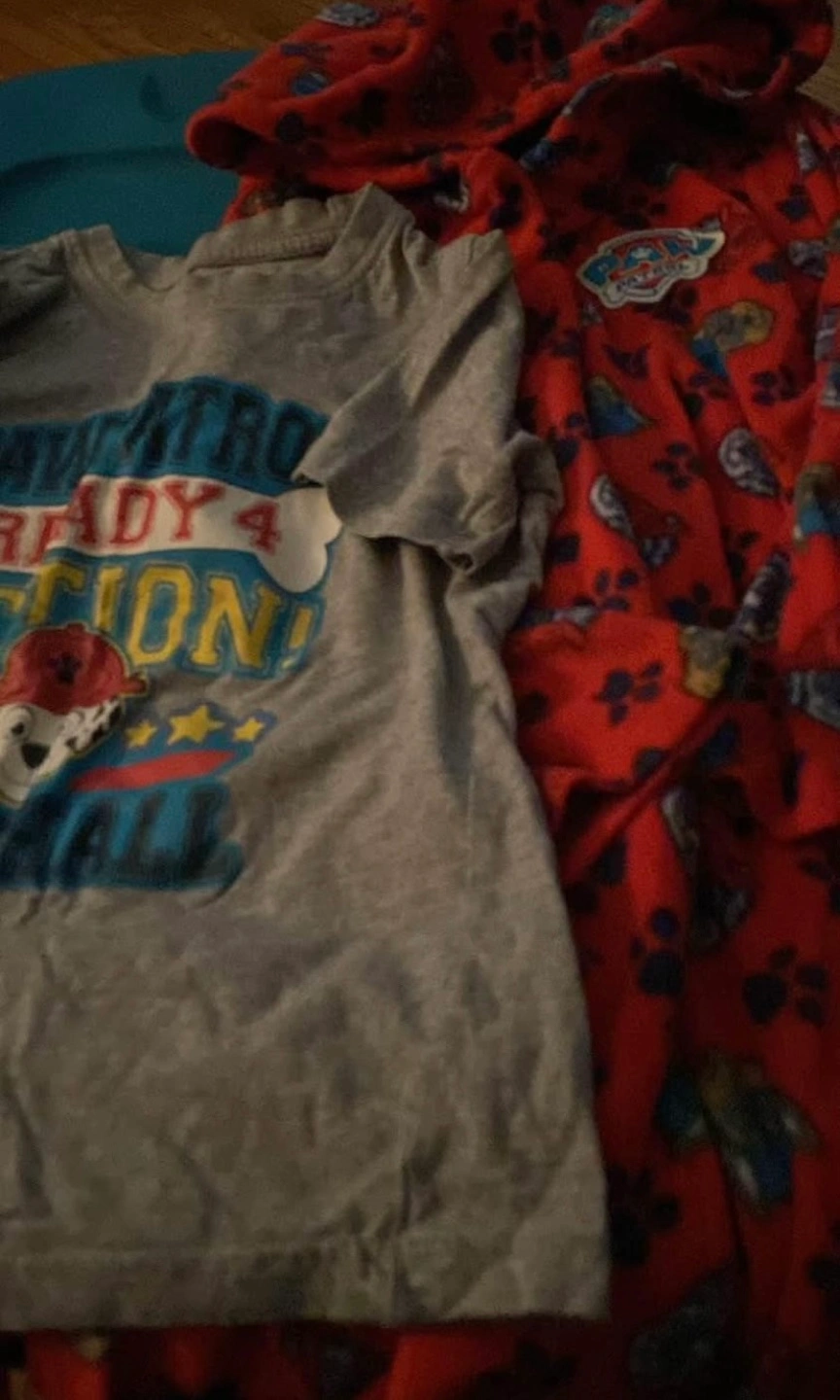 Grey t-shirt and red fleece robe. Size 6 No delivery. No holds. As is, no refunds. Price is firm.