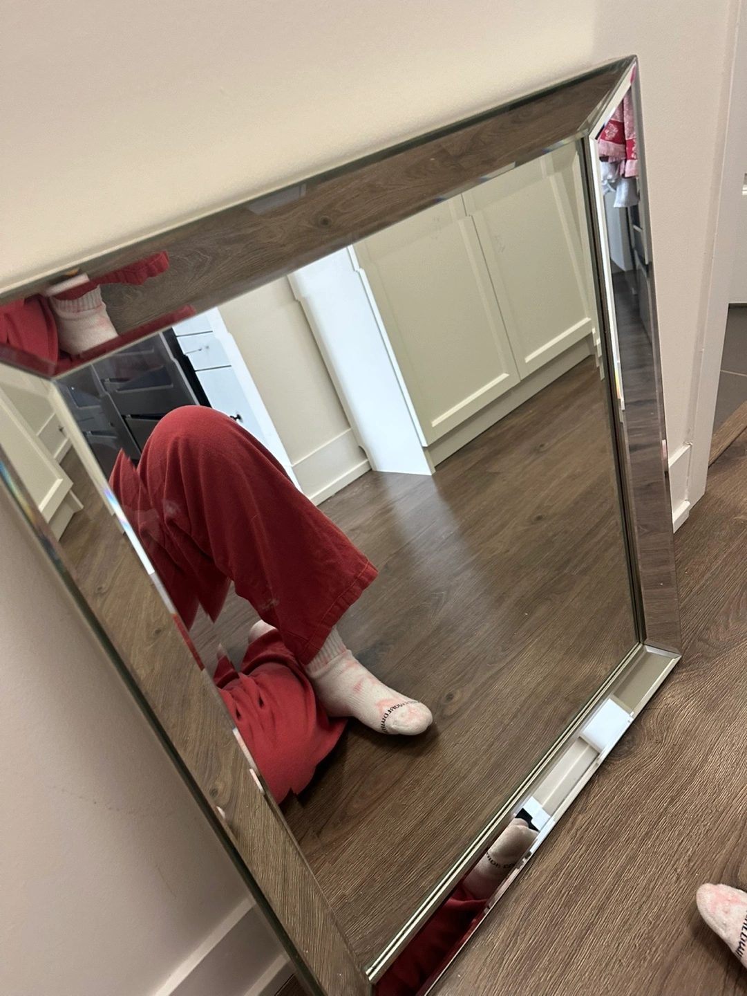 Large mirror. Bevelled edges. Ready to hang. Great for a hallway or bedroom. Slight imperfections