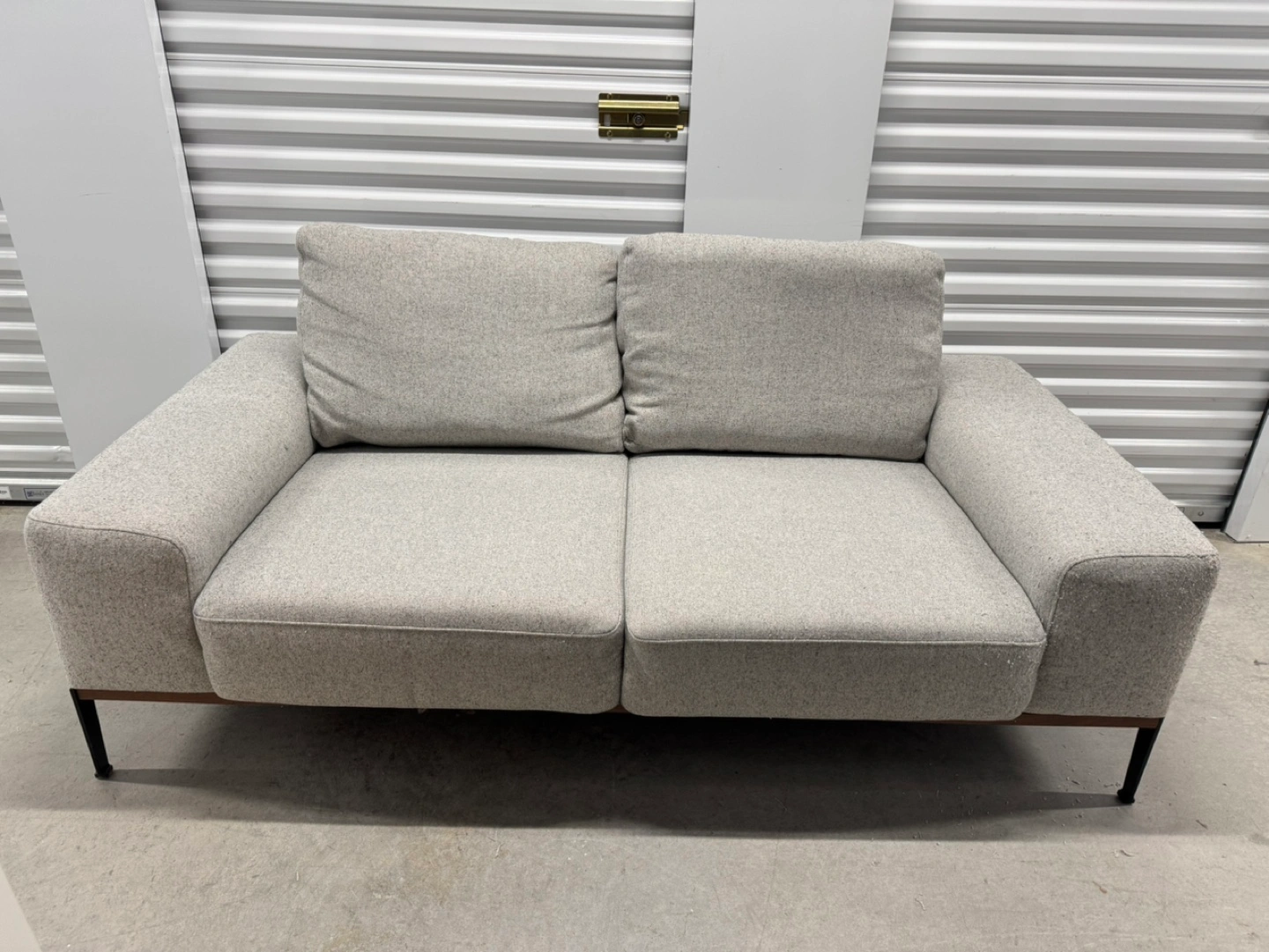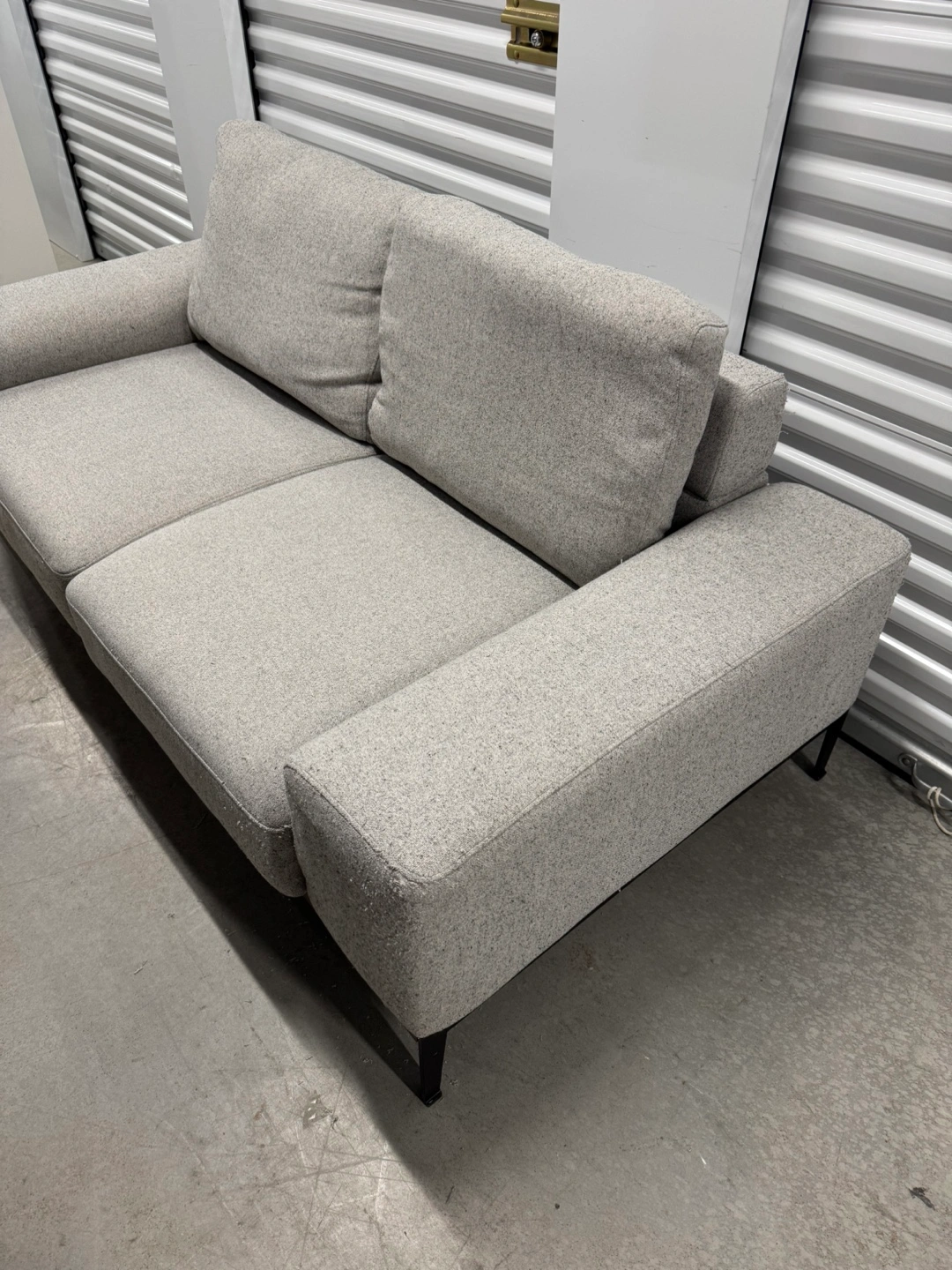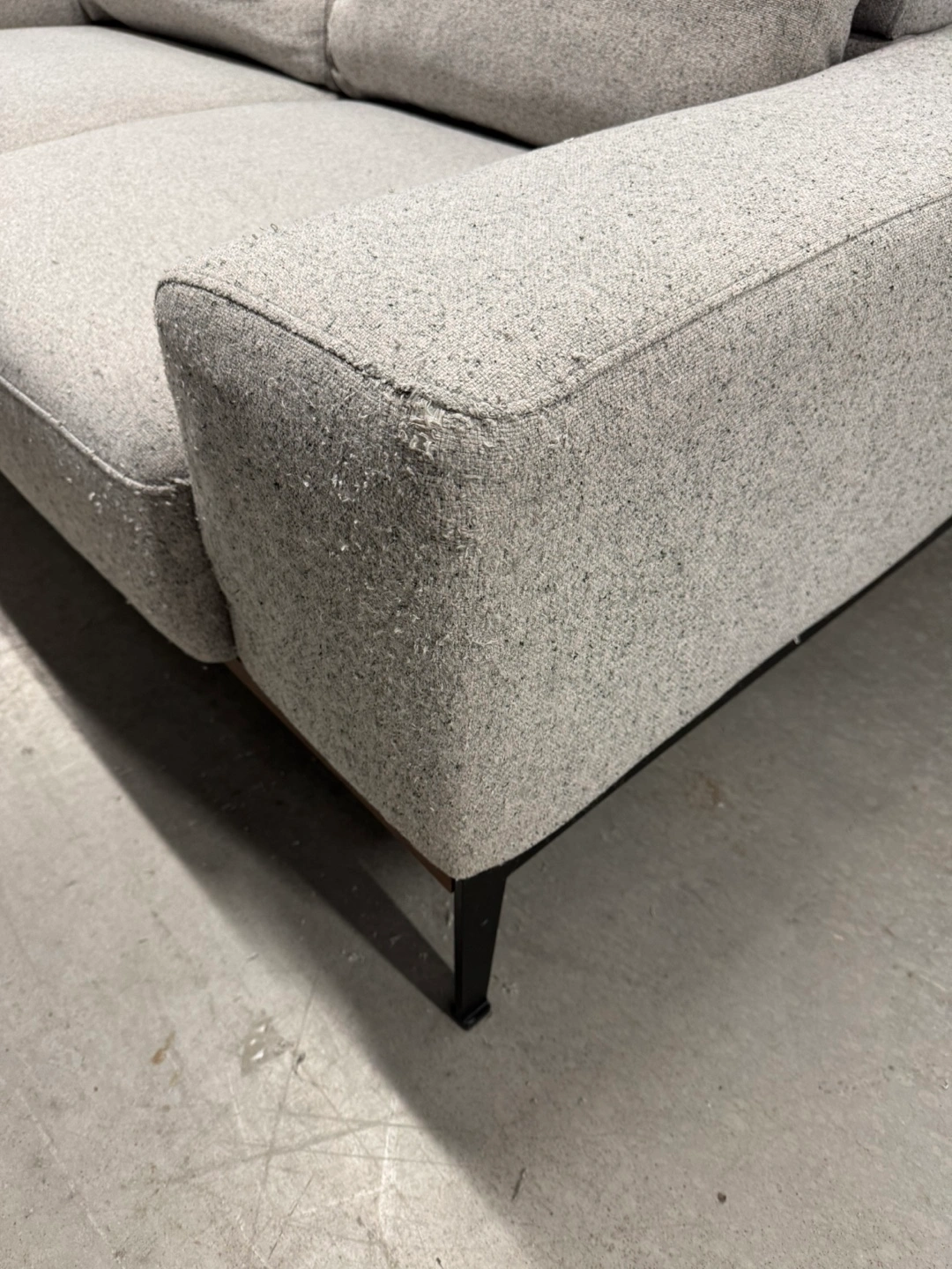 Light grey fabric sofa. Black metal legs. Modern design. Good condition. Note: it comes from a pet friendly house. Has some pet scratches as you can see in the pictures. Price reflects this. PRODUCT DIMENSIONS Width: 187 cm (74") Height: 70 cm (28") Depth: 96 cm (38") Delivery available for extra.