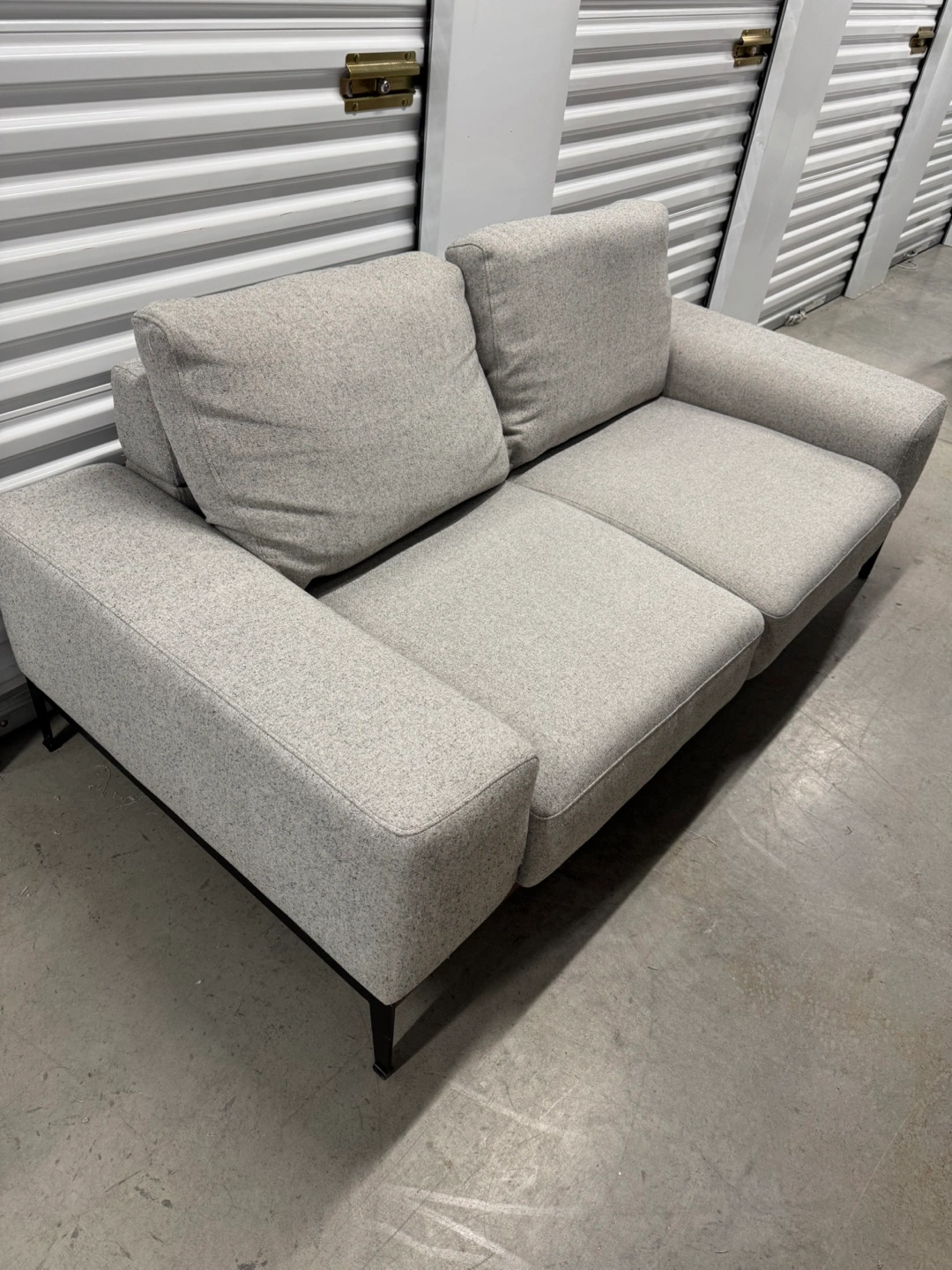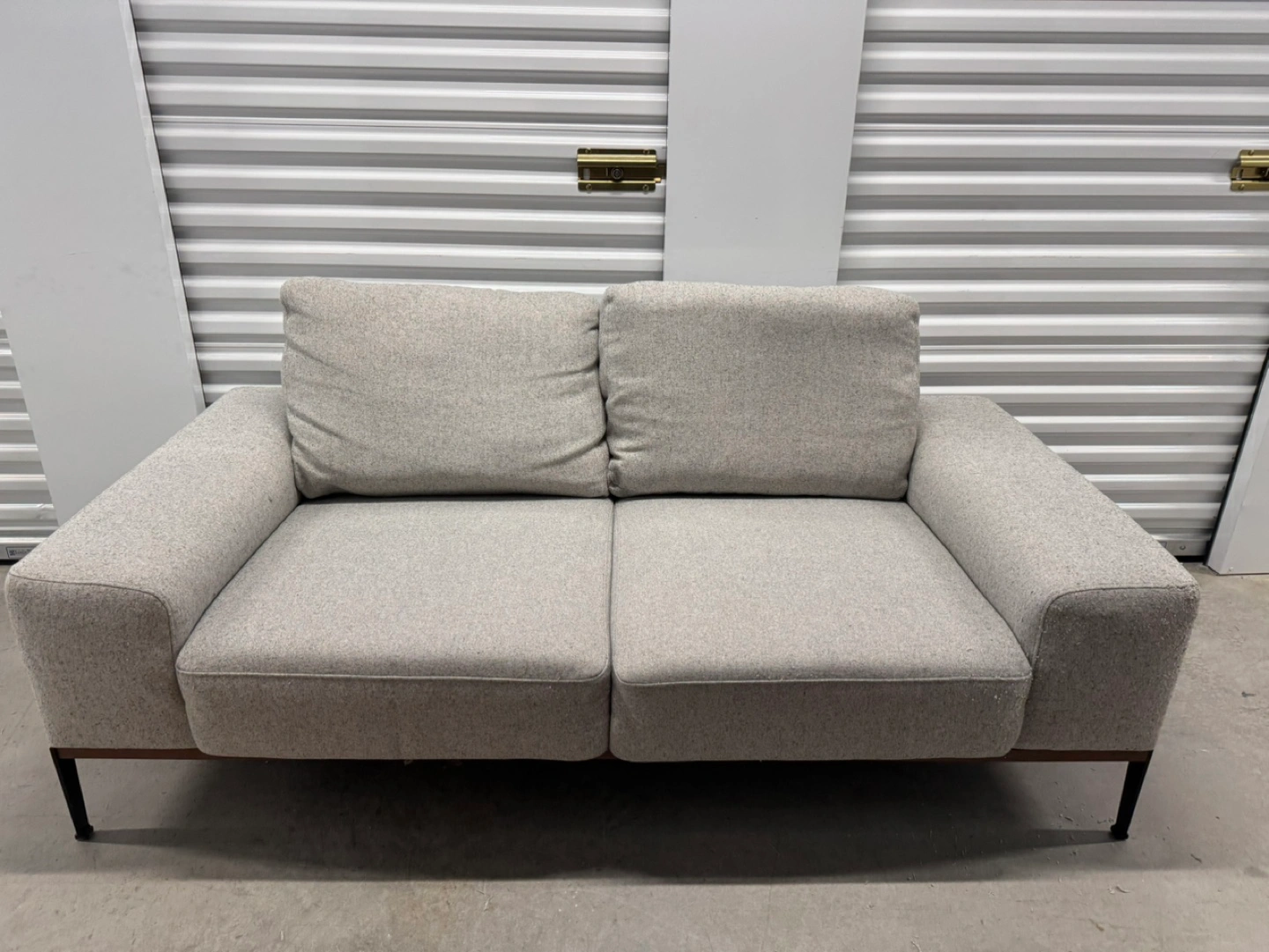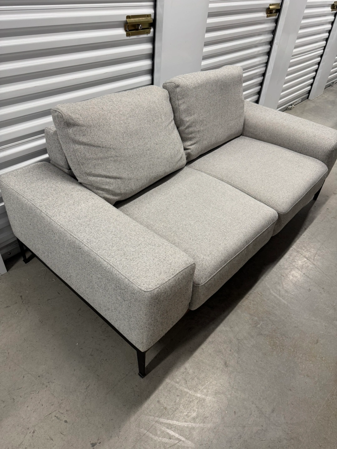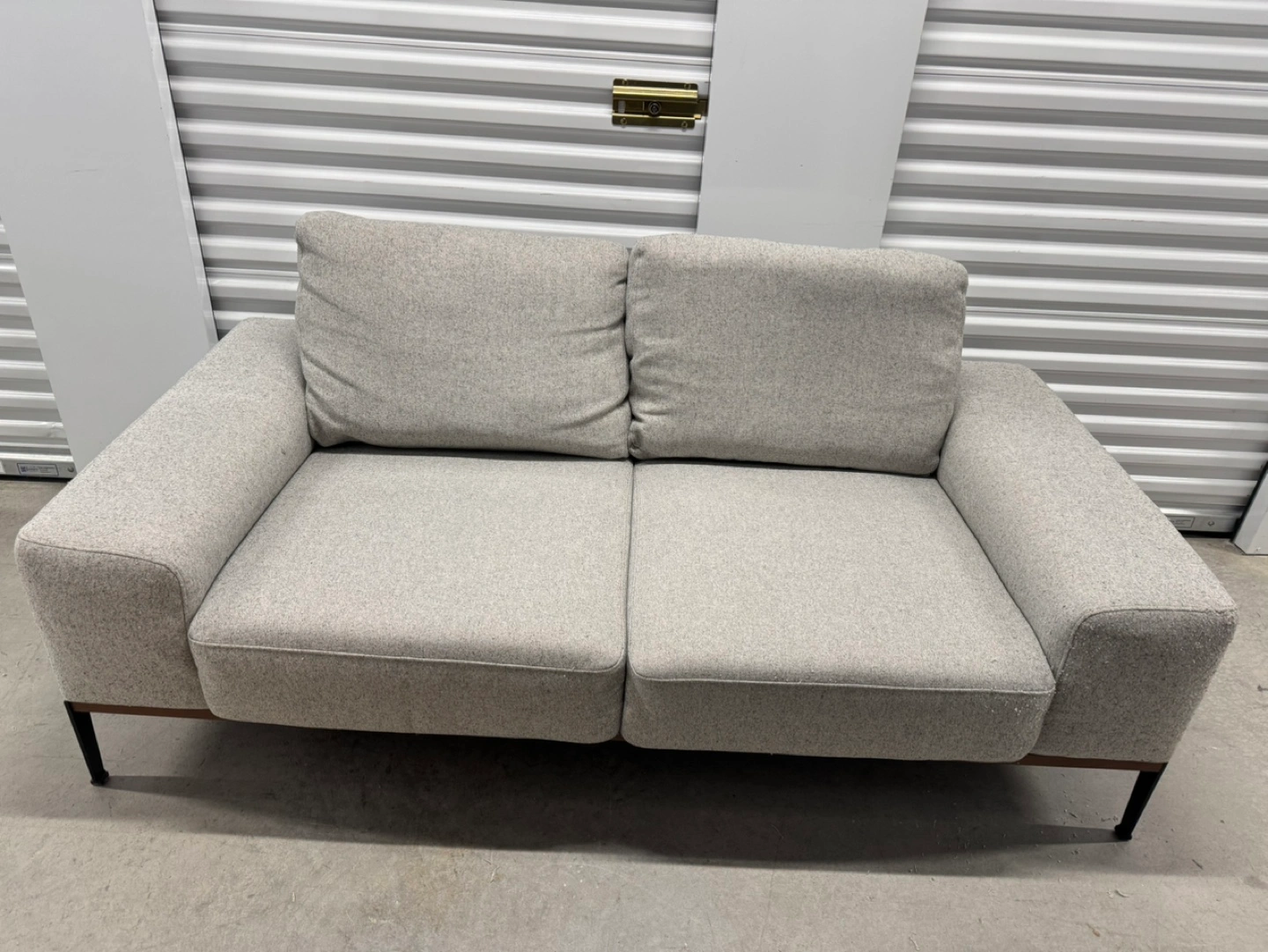 Light grey fabric sofa. Black metal legs. Modern design. Good condition. Note: it comes from a pet friendly house. Has some pet scratches as you can see in the pictures. Price reflects this. PRODUCT DIMENSIONS Width: 187 cm (74") Height: 70 cm (28") Depth: 96 cm (38") Delivery available for extra.