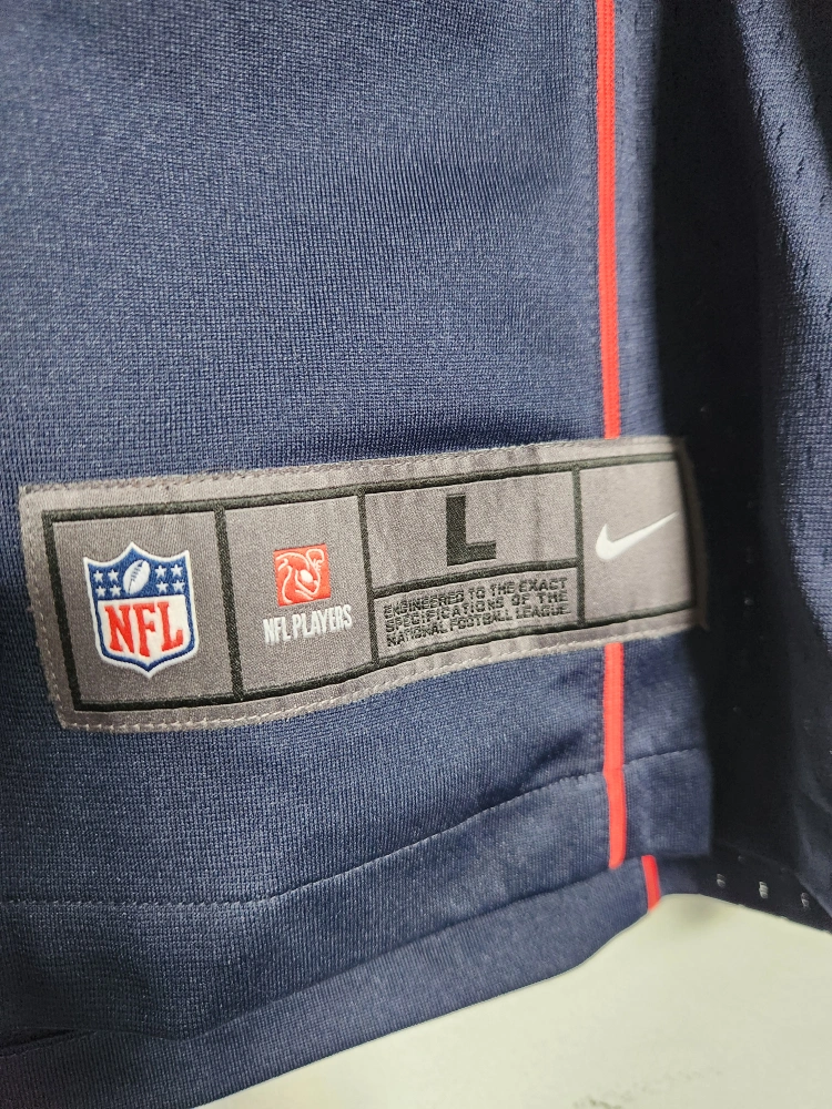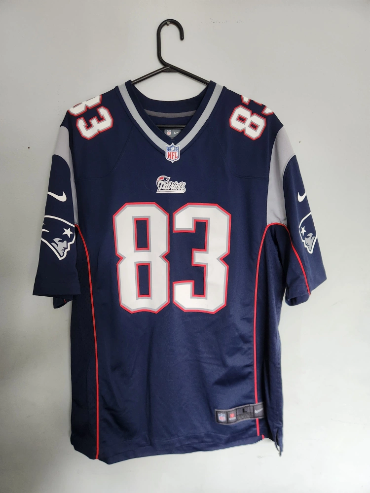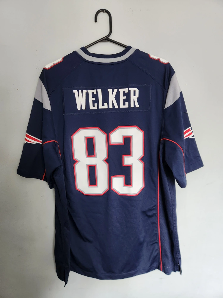 Men's size large New England Patriots jersey. Features Wes Welker's name and number. Nike brand. NFL Players label. Made in Guatemala.