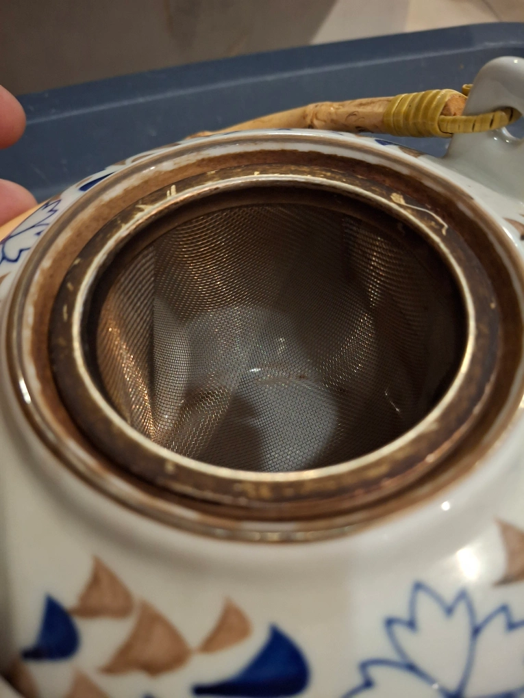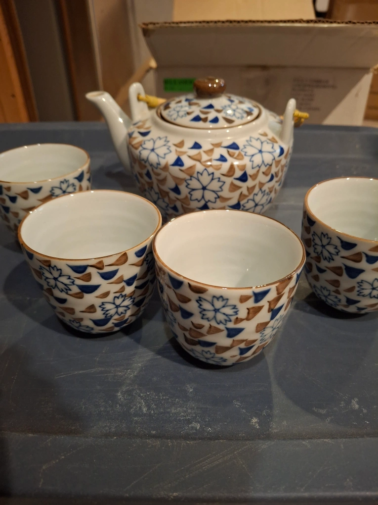 Beautiful vintage tea set. Includes teapot with infuser and four teacups. Features a lovely blue and brown floral pattern. Bamboo teapot handle.